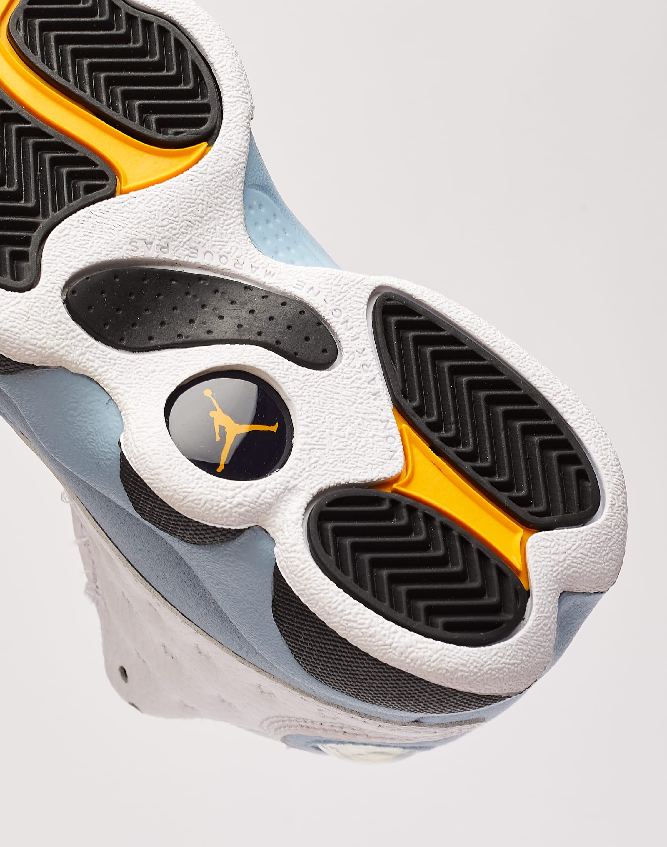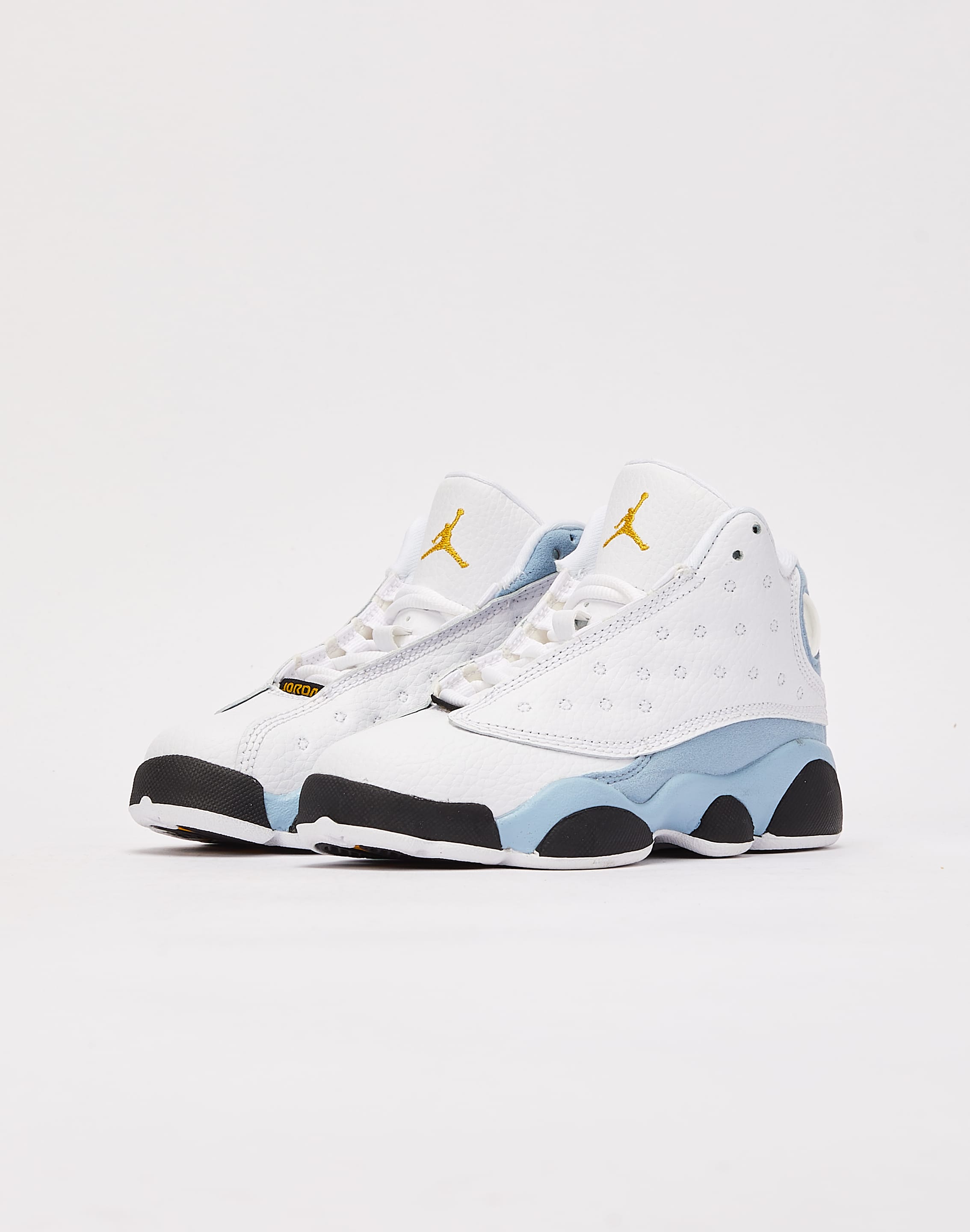 Meet the new Air Jordan 13 Retro "Blue Grey." This take on Michael Jordan's thirteenth signature model features a white tumbled leather upper with soft "Blue Grey" suede underlays. Bold "Yellow Ochre" hits add a bright pop of color.