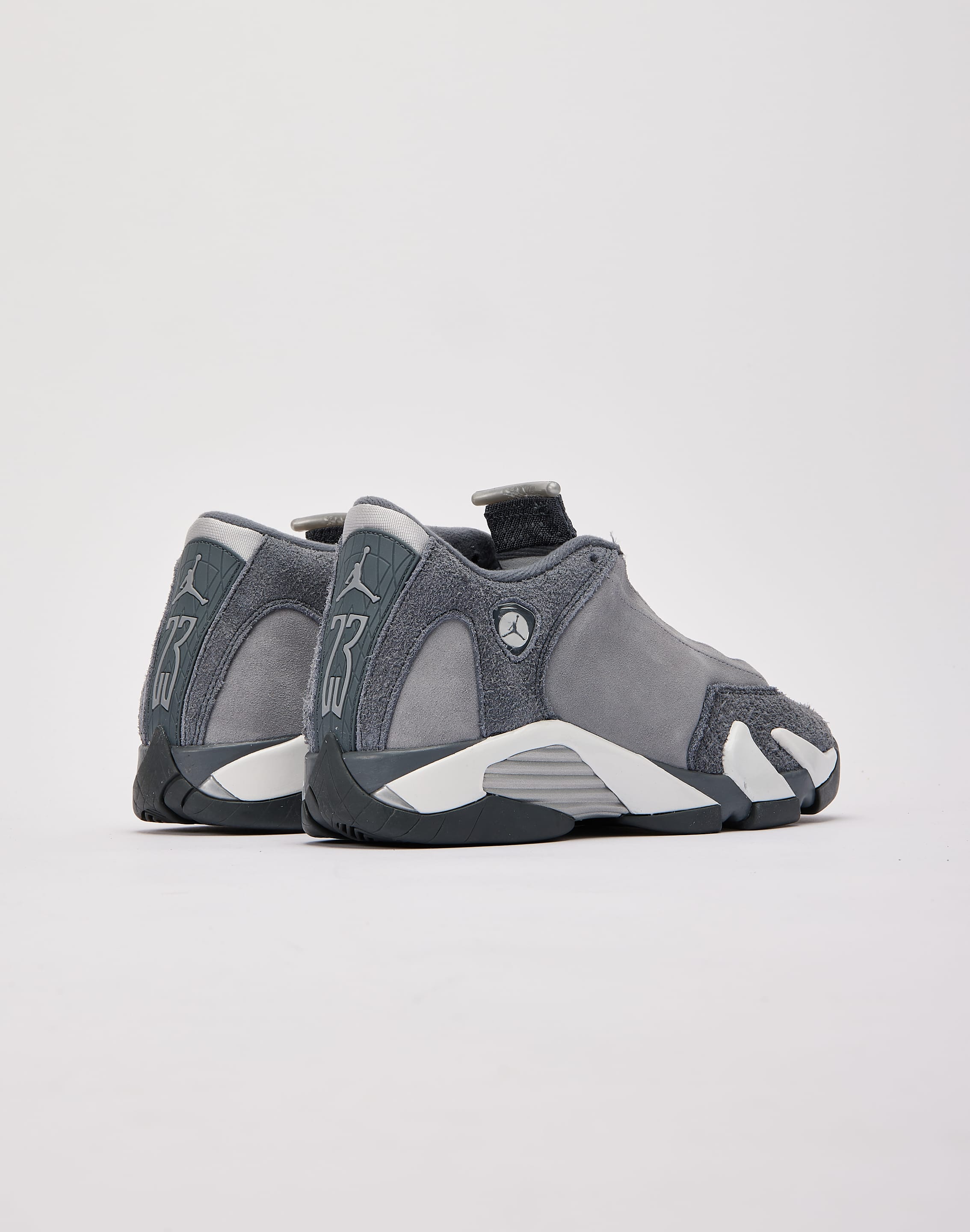 Remaining faithful to the iconic '98 blueprint, the Air Jordan 14 Retro "Flint Frey" maintains its signature low-cut silhouette, featuring dual Zoom Air units for a feather-light bounce. Crafted with "Flint Grey" and "Stealth" suedes, it presents a tonal look, complemented by accents of "Metallic Silver" and a pristine white midsole for a touch of striking contrast.