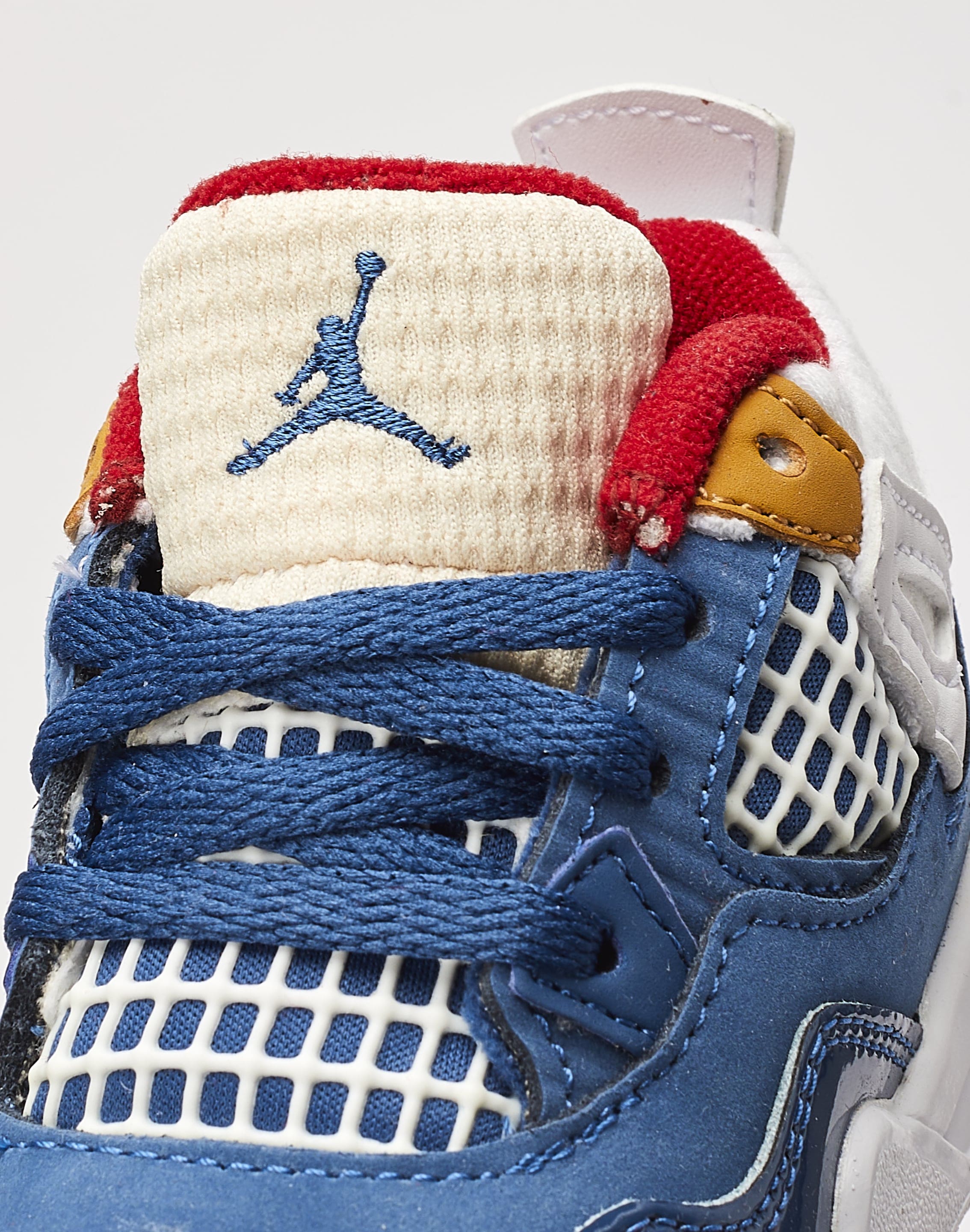 Inspired by messy childhood bedrooms, this kids'-exclusive Air Jordan 4 Retro "French Blue" features a mix of various materials and colors.
