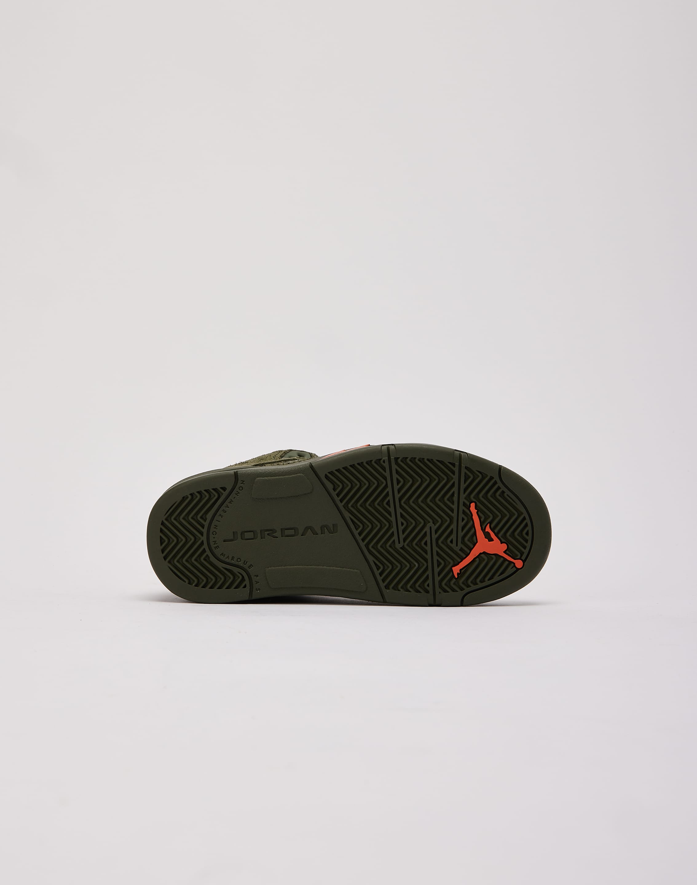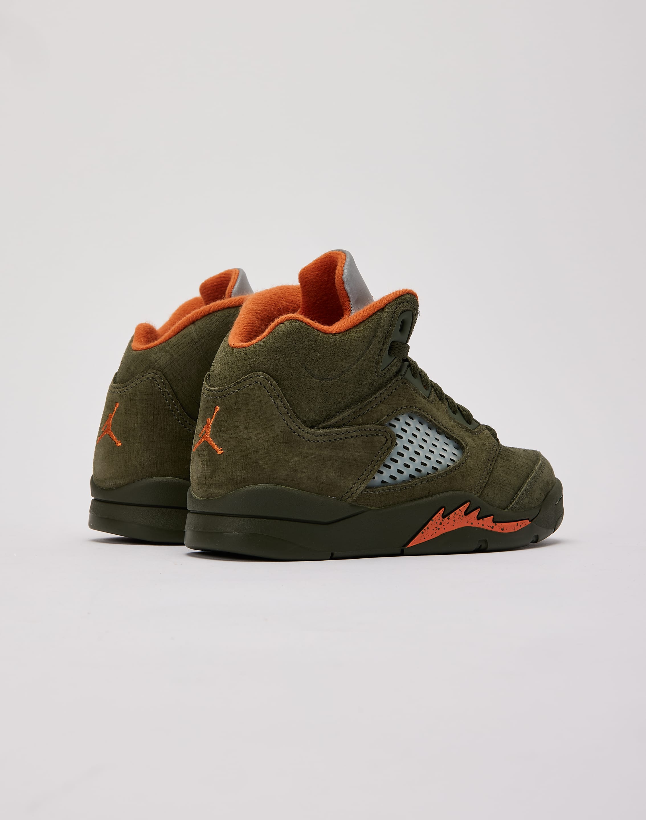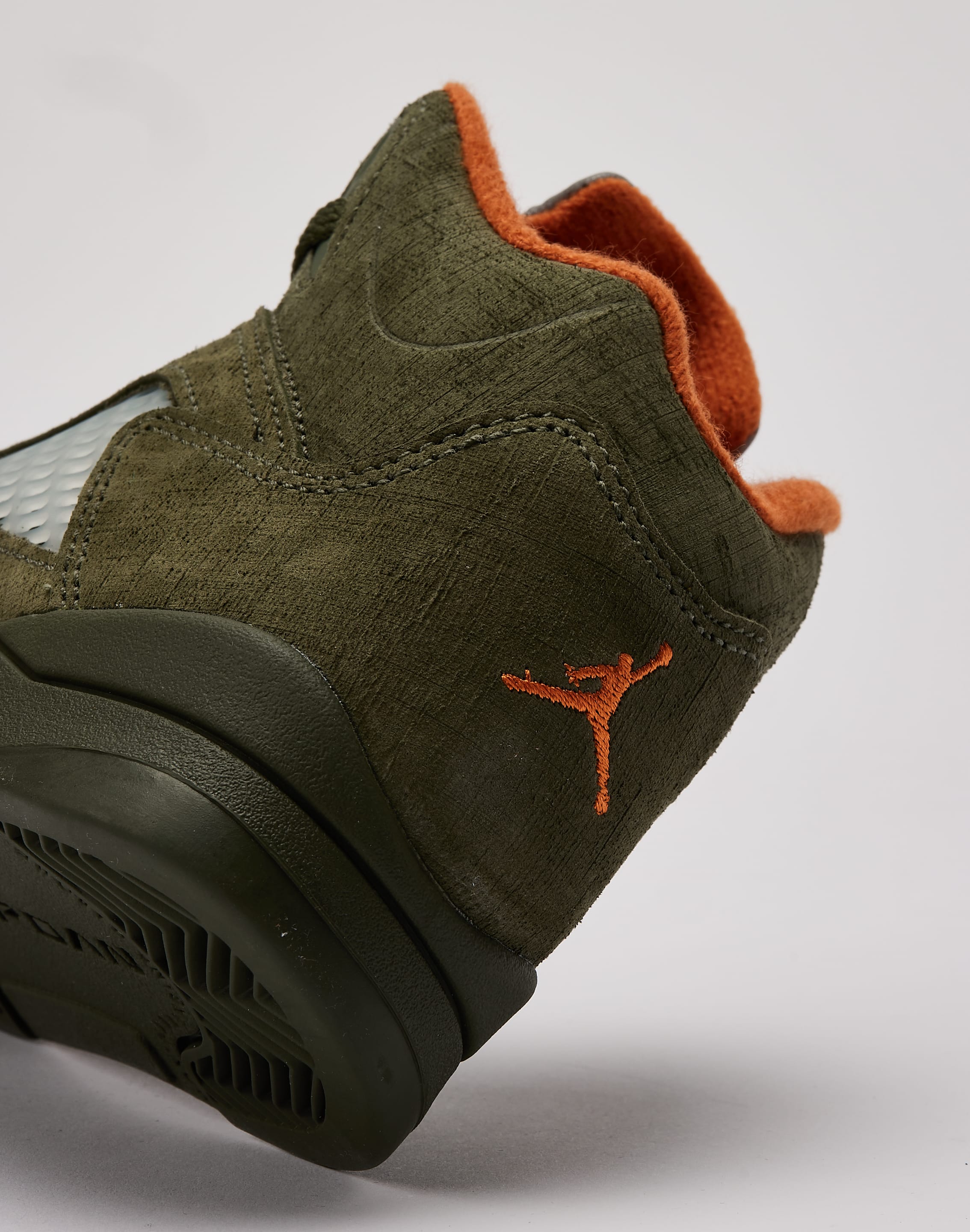 For the first time since 2006, the fan-favorite Air Jordan 5 Retro "Olive" is back. This modern pair features an earthy "Army Olive" suede upper accented with bright "Solar Orange" hits.