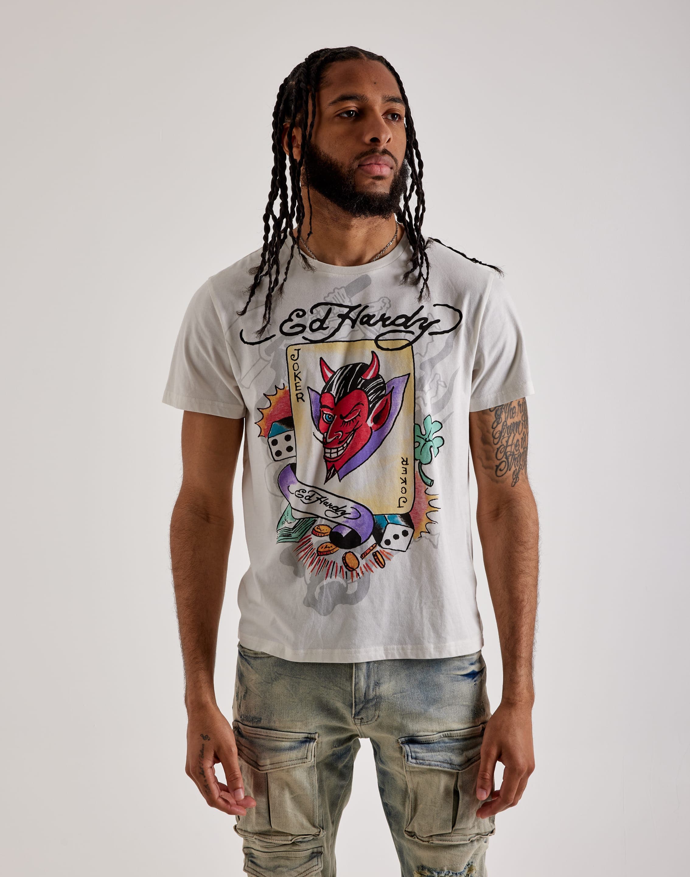 Throw it back to the early 2000s with this tattoo-inspired T-shirt from Ed Hardy. The Joker Tee features colorful graphics and signature Ed Hardy branding. It's made with soft cotton for comfortable wear in any weather.