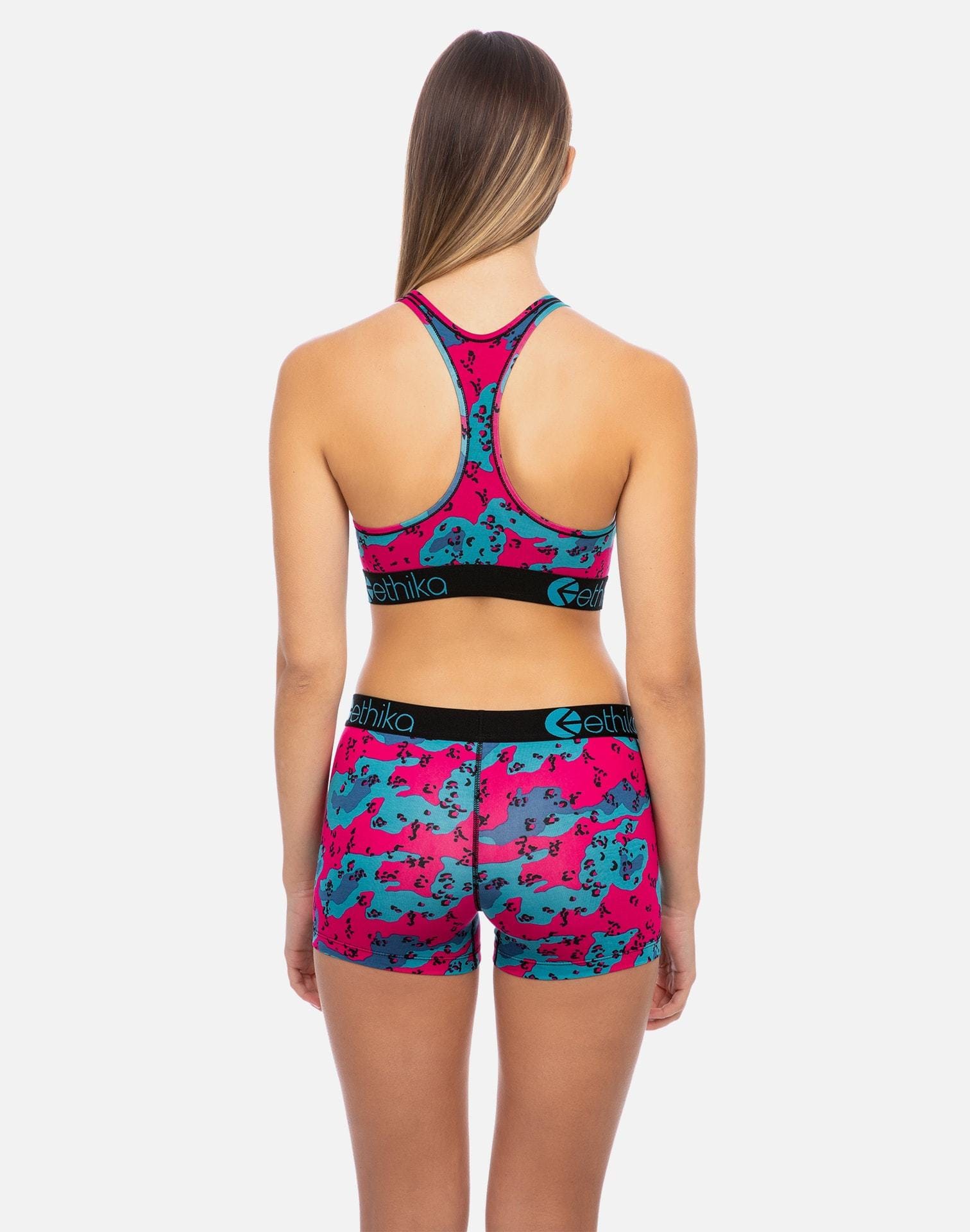 Don't underestimate the power of a comfortable sports bra. The Desert Camo Sports Bra from Ethika is cut from an ultra-soft cotton-modal blended fabric, and features a pink and teal desert camo print throughout for a unique look. With fixed racer back straps, and a thick and comfortable underbust band that includes embossed Ethika branding throughout, this sports bra is the perfect choice for your active lifestyle.