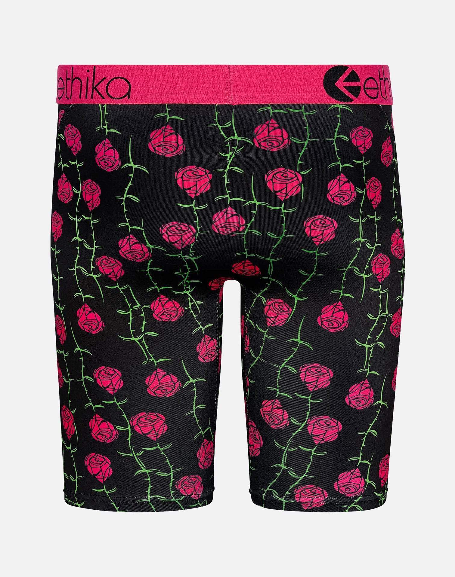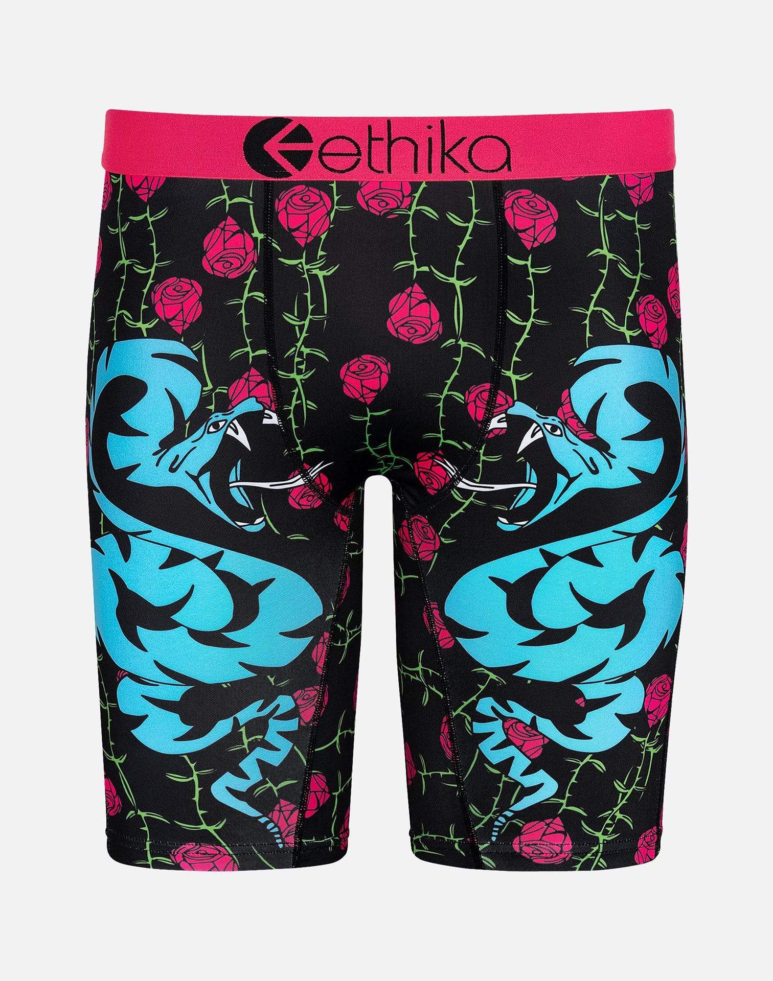 Add some classic style to your drawer with these Snaked Boxer Briefs. Ethika's boxers features a colorful color way with a blue cobra snake on each hip and rose print throughout.