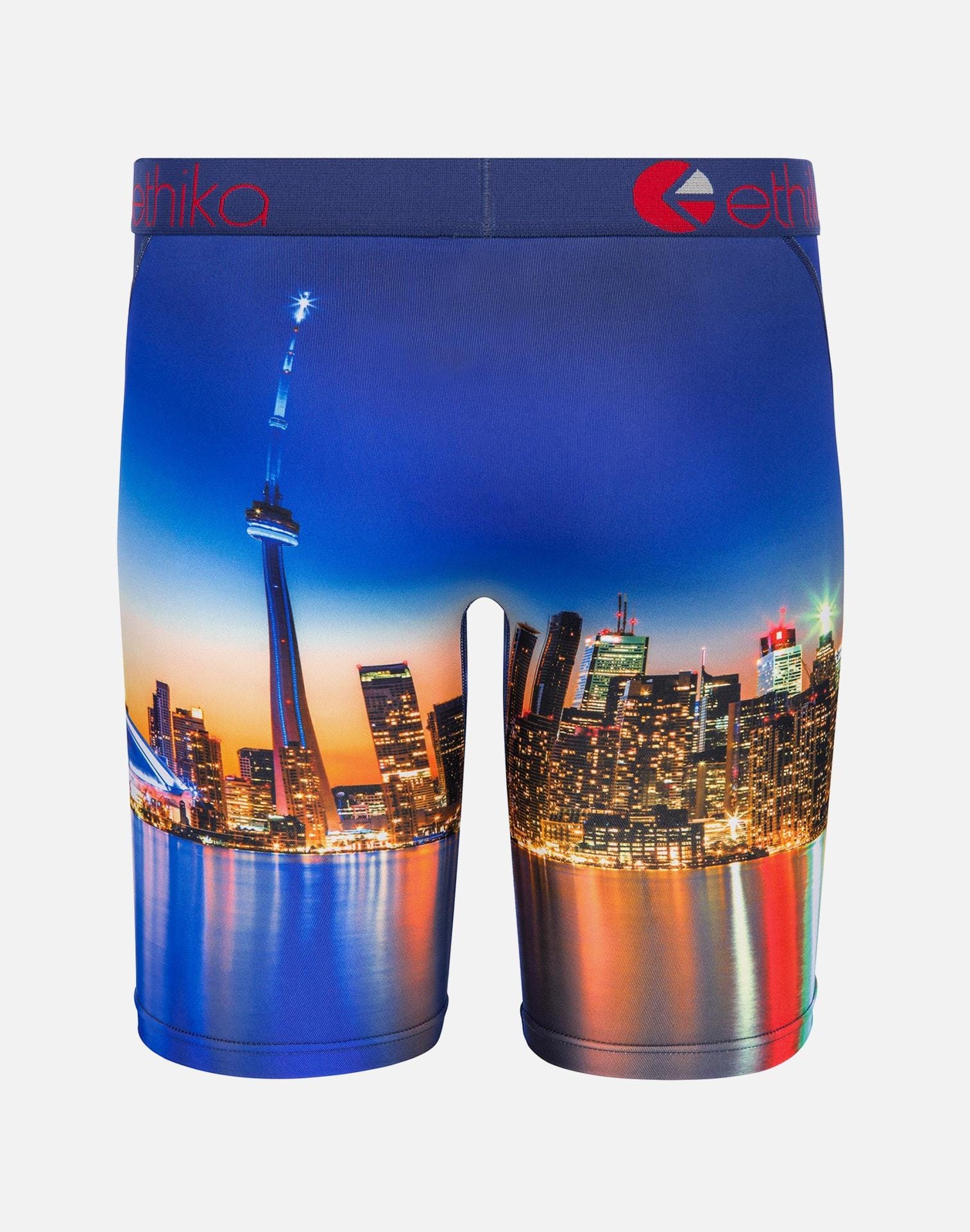 So you're from Canada, eh? Represent your home town with the Toronto Eh blue boxer briefs from Ethika. Coming with a soft, elastic construction, these breathable boxer briefs feature a sublimated graphic of the Toronto skyline at dusk complete with the CN tower for iconic styling.