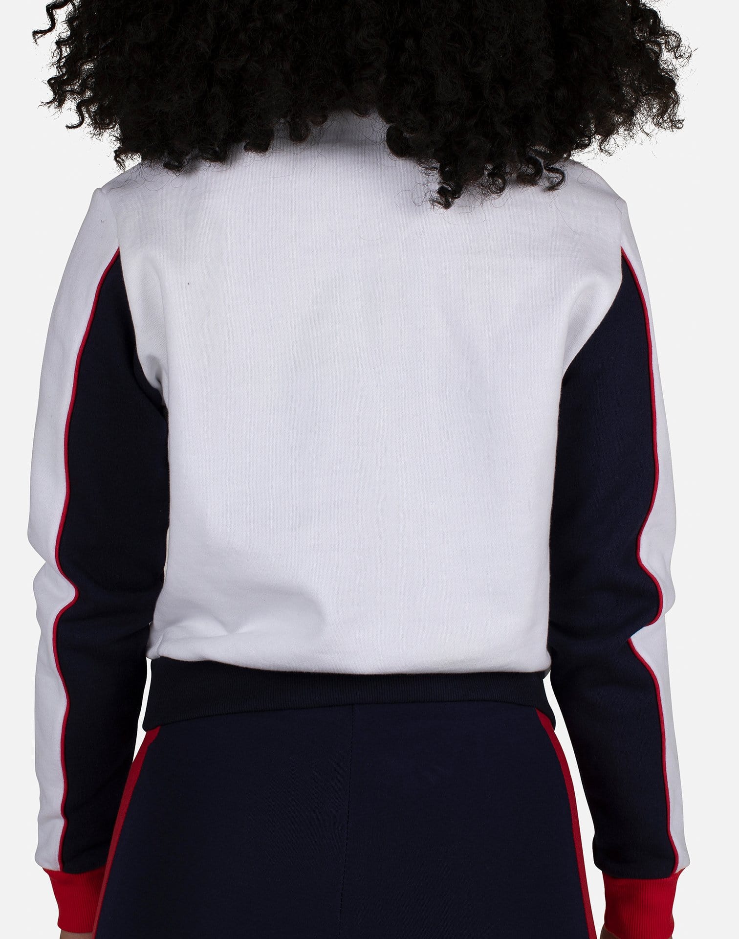A sportswear favorite. The FILA Nuria Colorblock Sweatshirt is a cozy, chic, sporty inspired sweater complete with a classic crew neckline, long sleeves, the brand’s signature red, white and navy hued palette and a color blocked design. Rock with your favorite dark wash denim or biker shorts to complete the look.