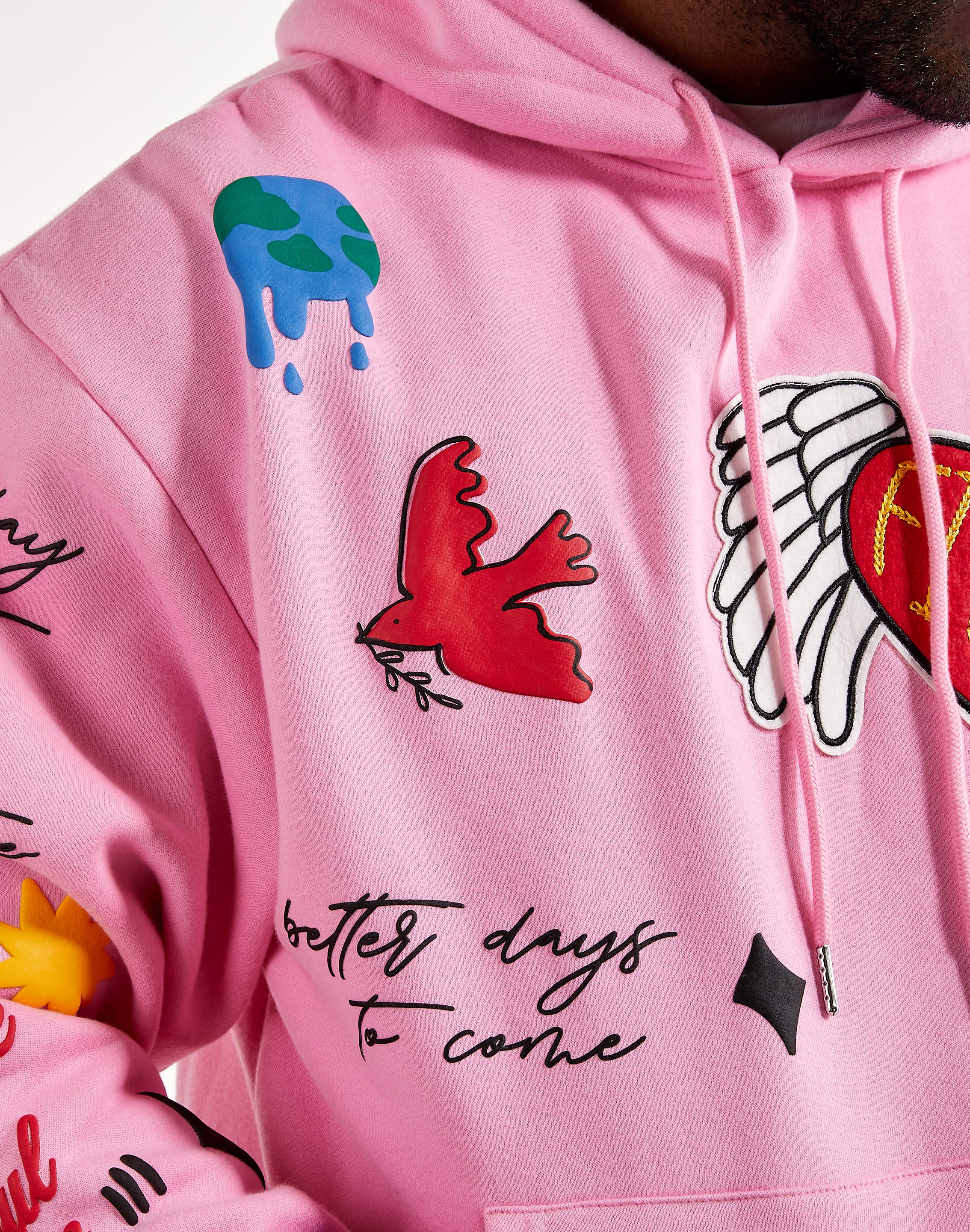 Start off your layered look with First Row's Flying Heart Fleece Hoodie. This cozy pullover sweatshirt comes covered in printed graphics and embroidered patches.