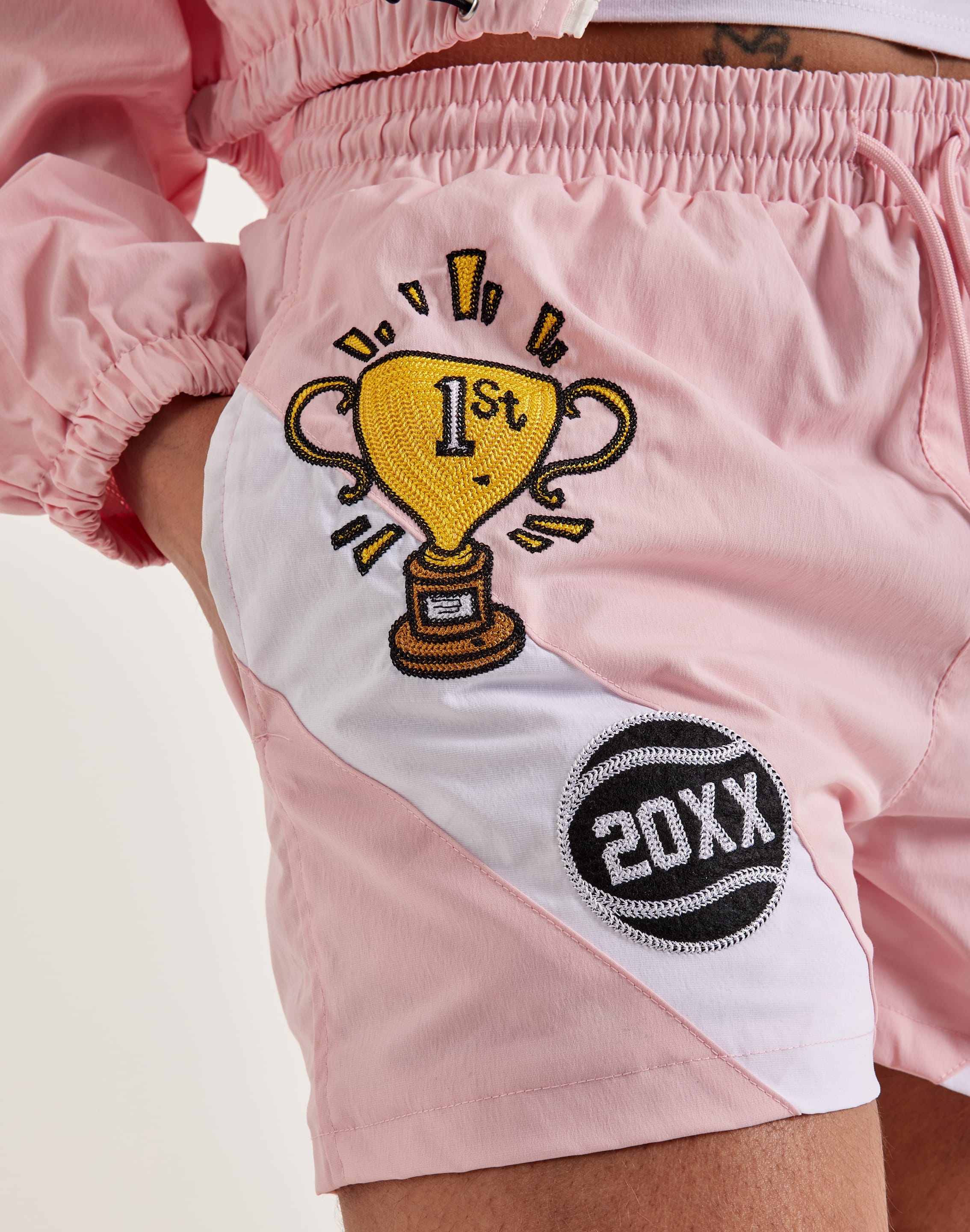 Grab your racket and serve in these Nylon Tennis Shorts from First Row. These women's shorts are crafted from a lightweight, breathable nylon material and feature tennis-themed patches throughout. Pair them with the matching jacket for the full look.