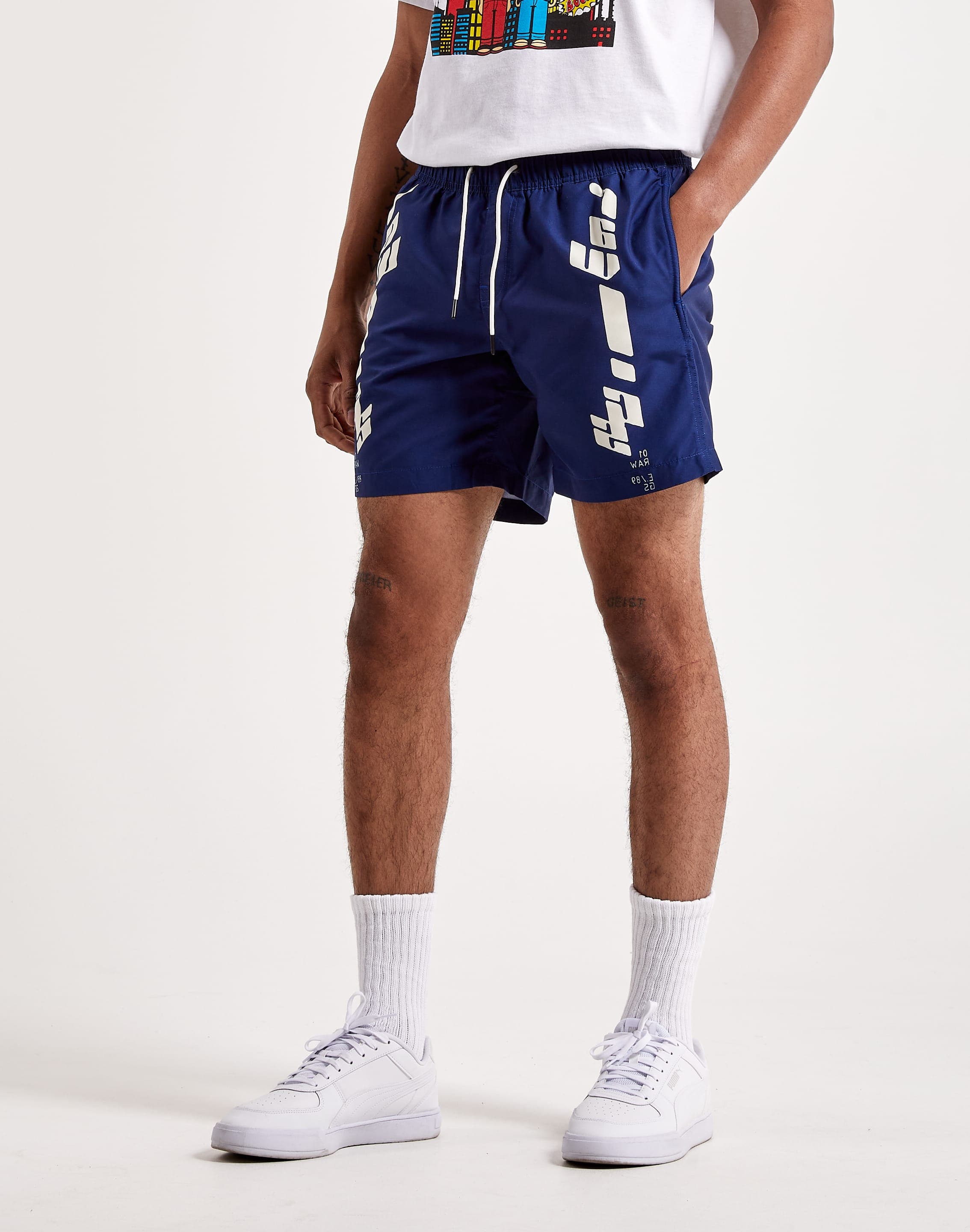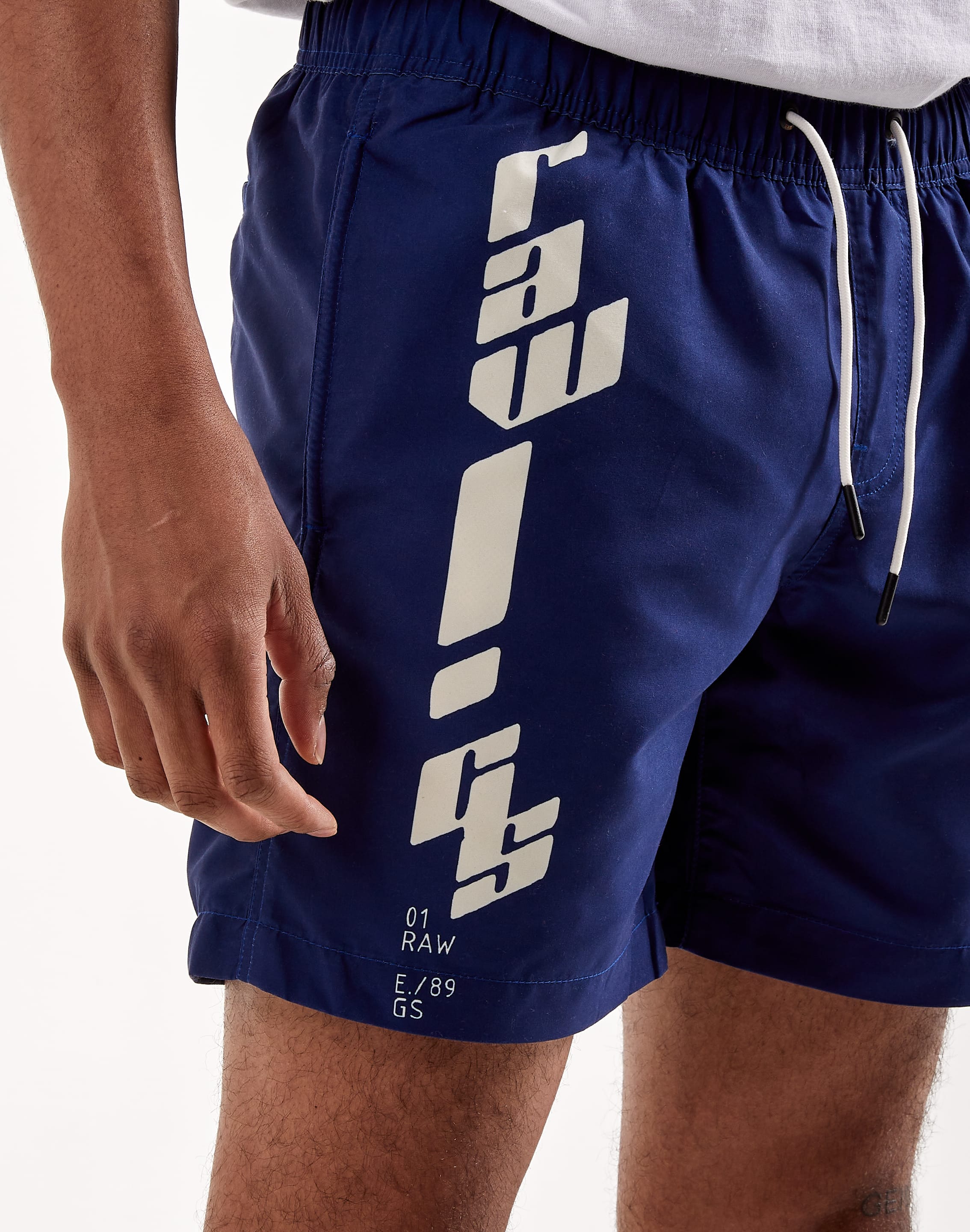 These Dirik RAW swim shorts feature a graphic print at the front legs. Side seam pockets are combined with a single welt pocket at the back. The waist offers elastic with an incorporated drawcord. Inside, a mesh lining adds support.