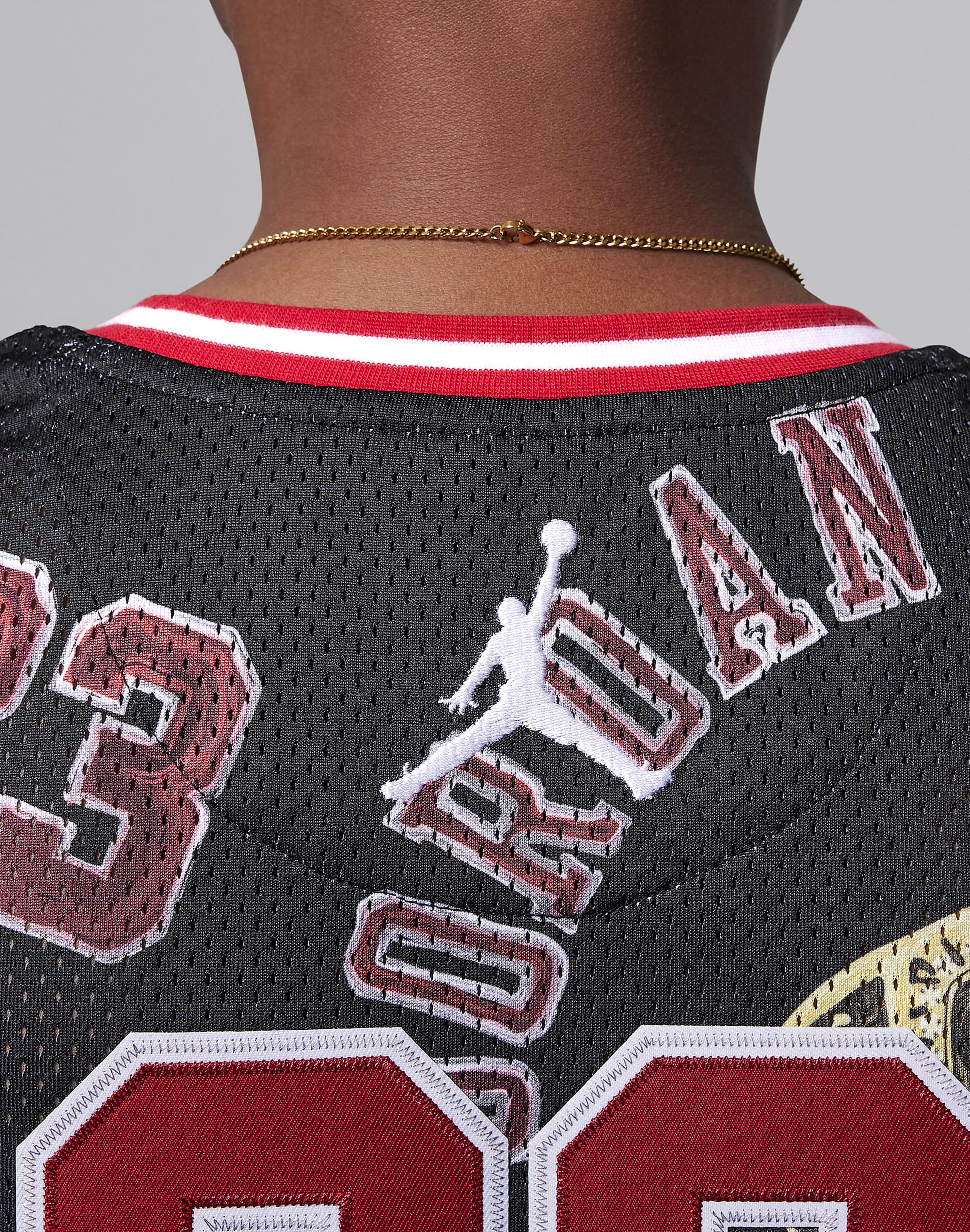 Drawing inspiration from Michael Jordan's iconic jersey, this garment is crafted from breathable knit mesh fabric, offering a regular fit that's equally suited for dominating the court or effortlessly pairing with your favorite jeans for a stylish, streetwear-inspired ensemble.