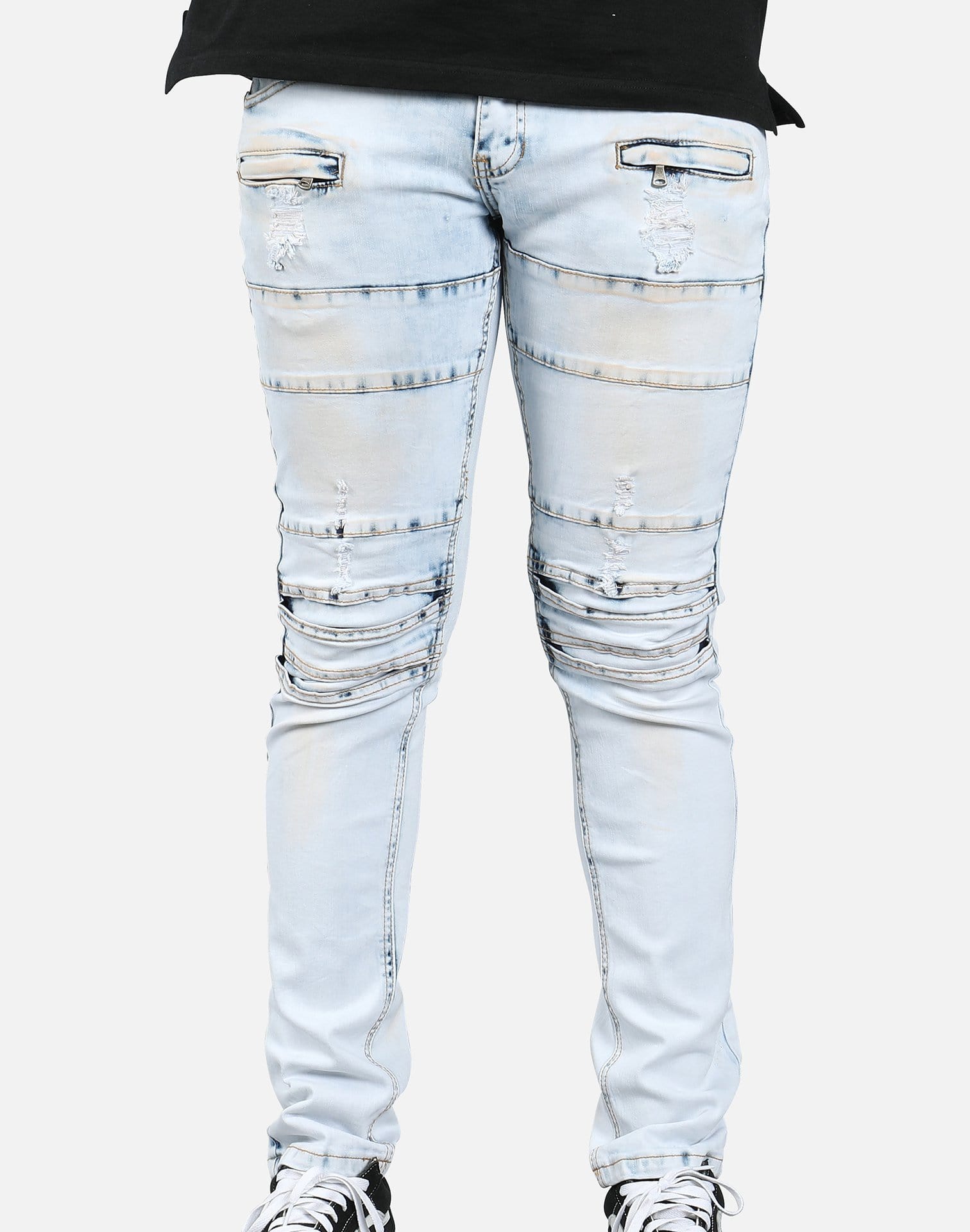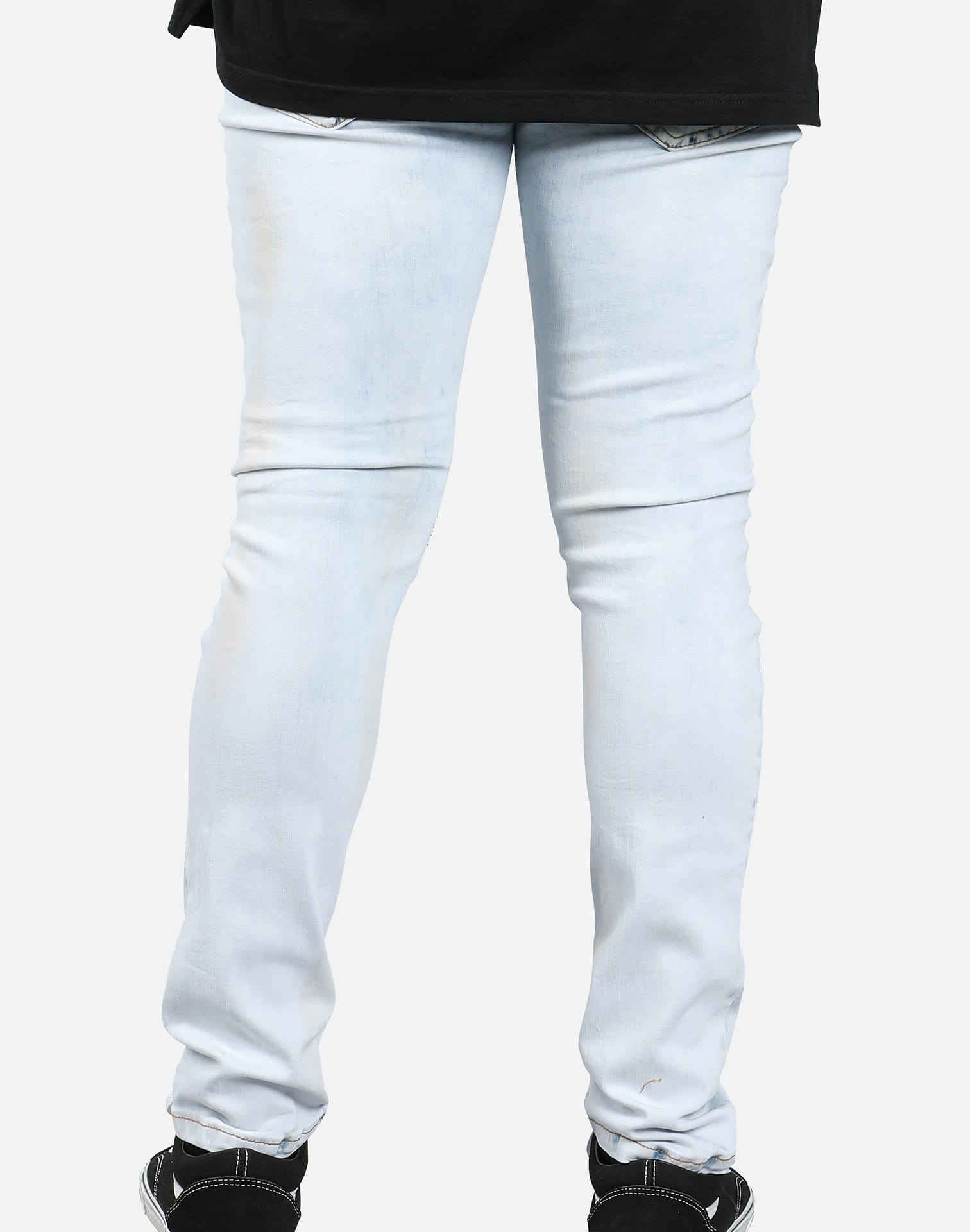 Give yourself a little extra room to move with the knee seam ripped jeans from Kilogram Inc. These light blue jeans feature articulated knee panels and custom hand cut rips and tears up and down the legs. Pair these jeans with an elongated tee and some high tops for a complete look.