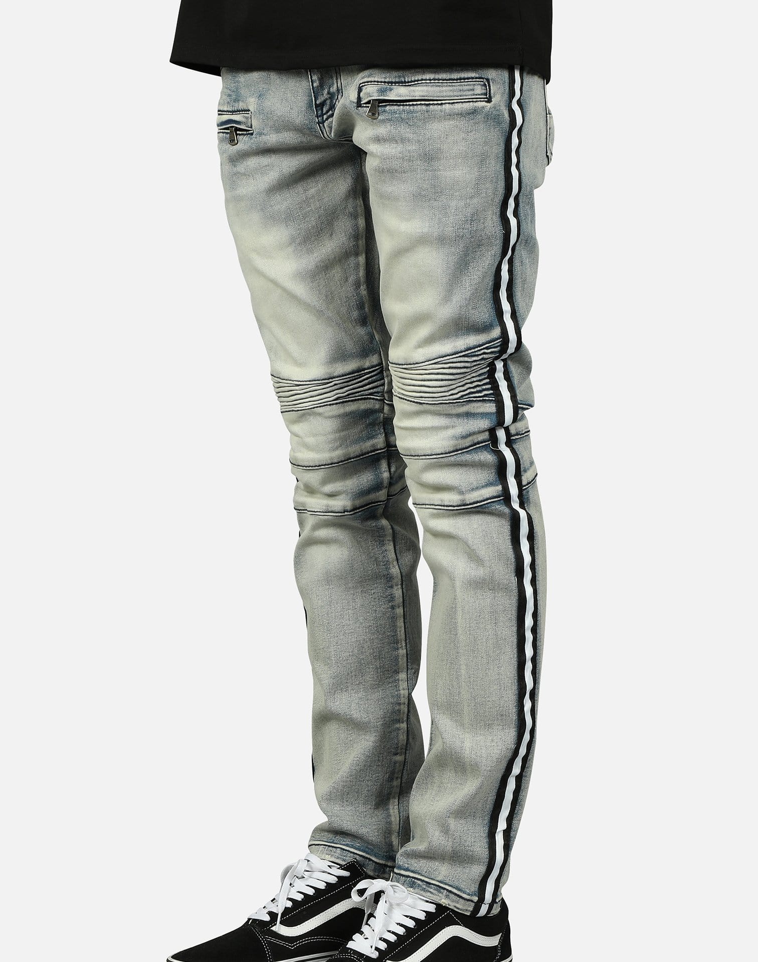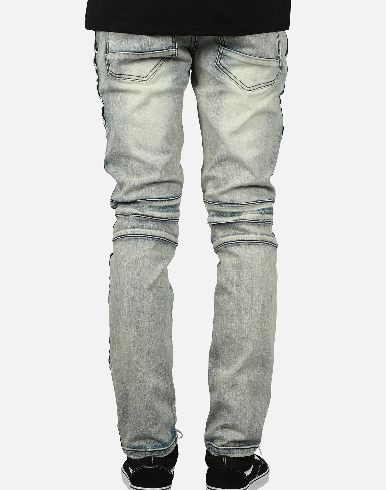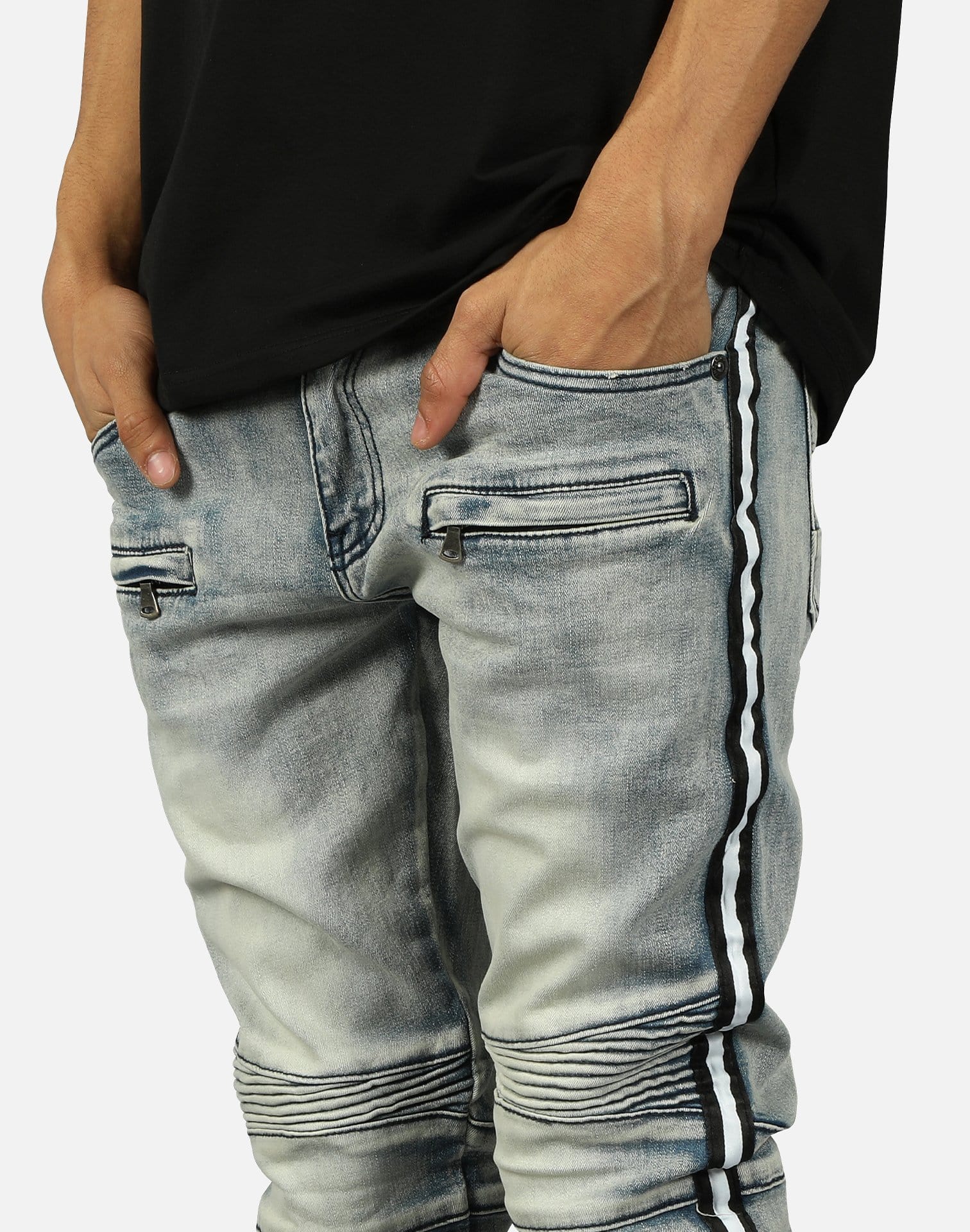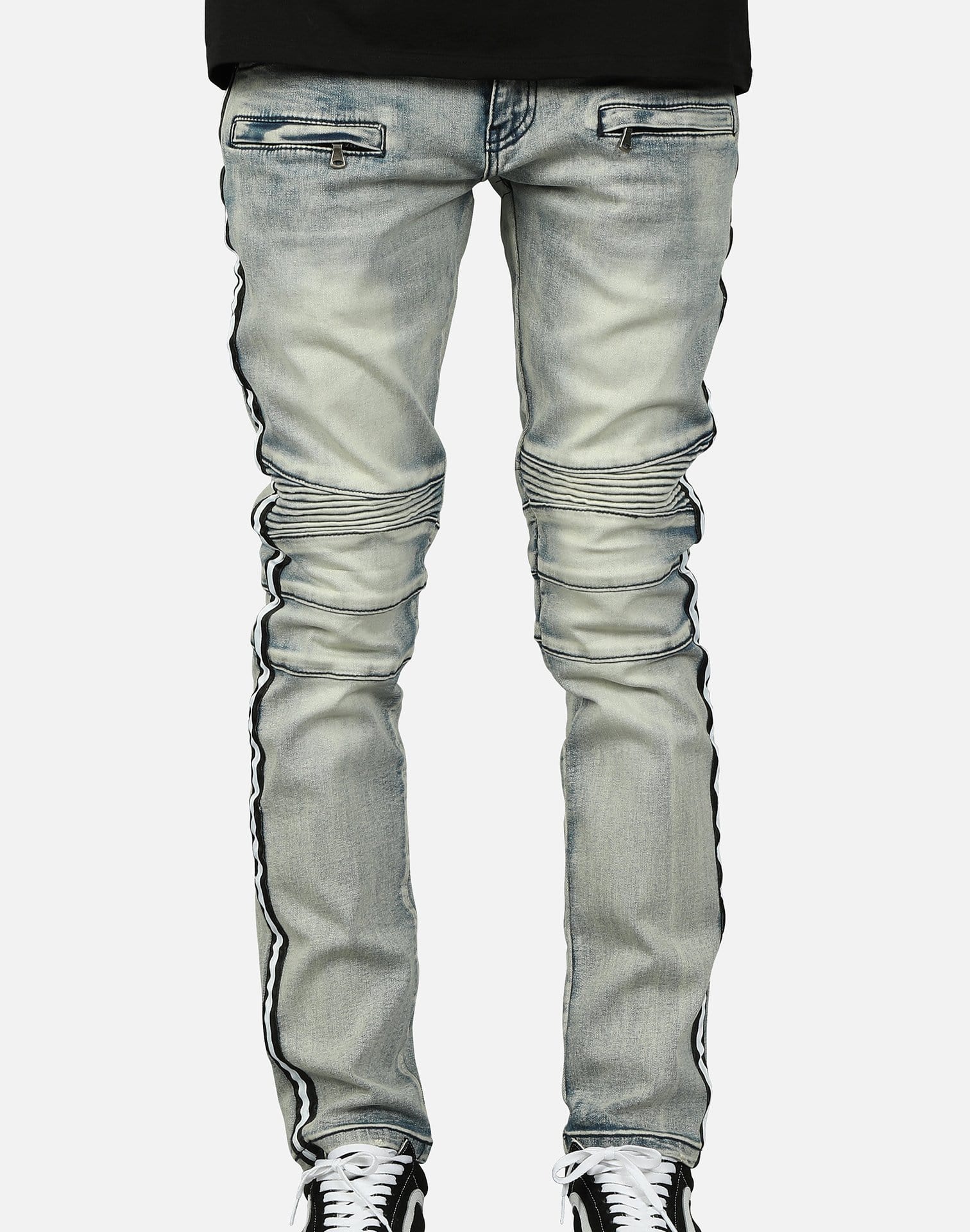 Kilogram Inc. includes a variety of denim, from biker-inspired to ripped and destructed. These striped motor back jeans featured in light blue showcase rips and tears with a biker theme throughout.