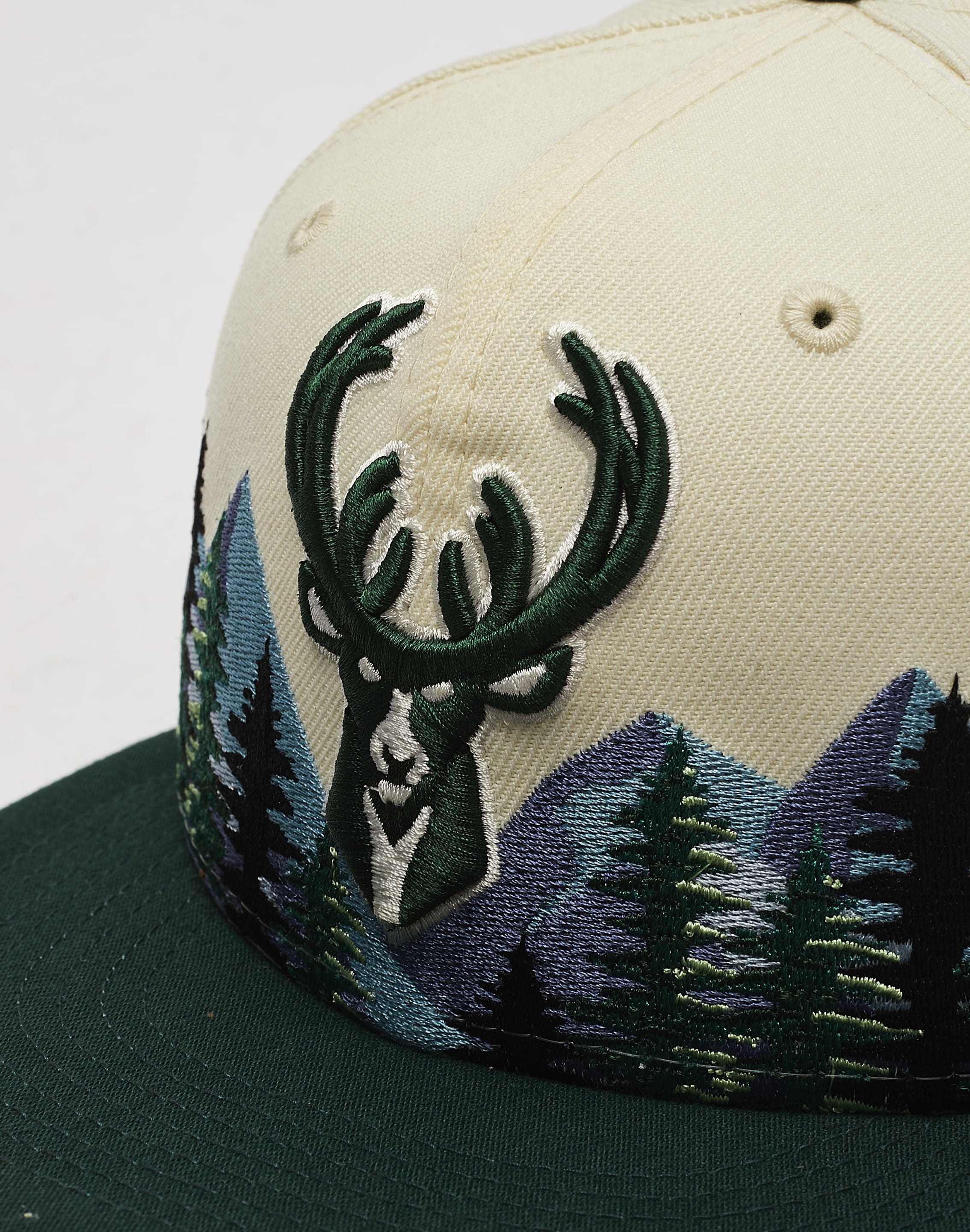 Take the great outdoors with you wherever you go with the New Era Milwaukee Bucks Outdoor 59Fifty Fitted Hat. It features classic Bucks logo branding along with embroidered trees and mountains.