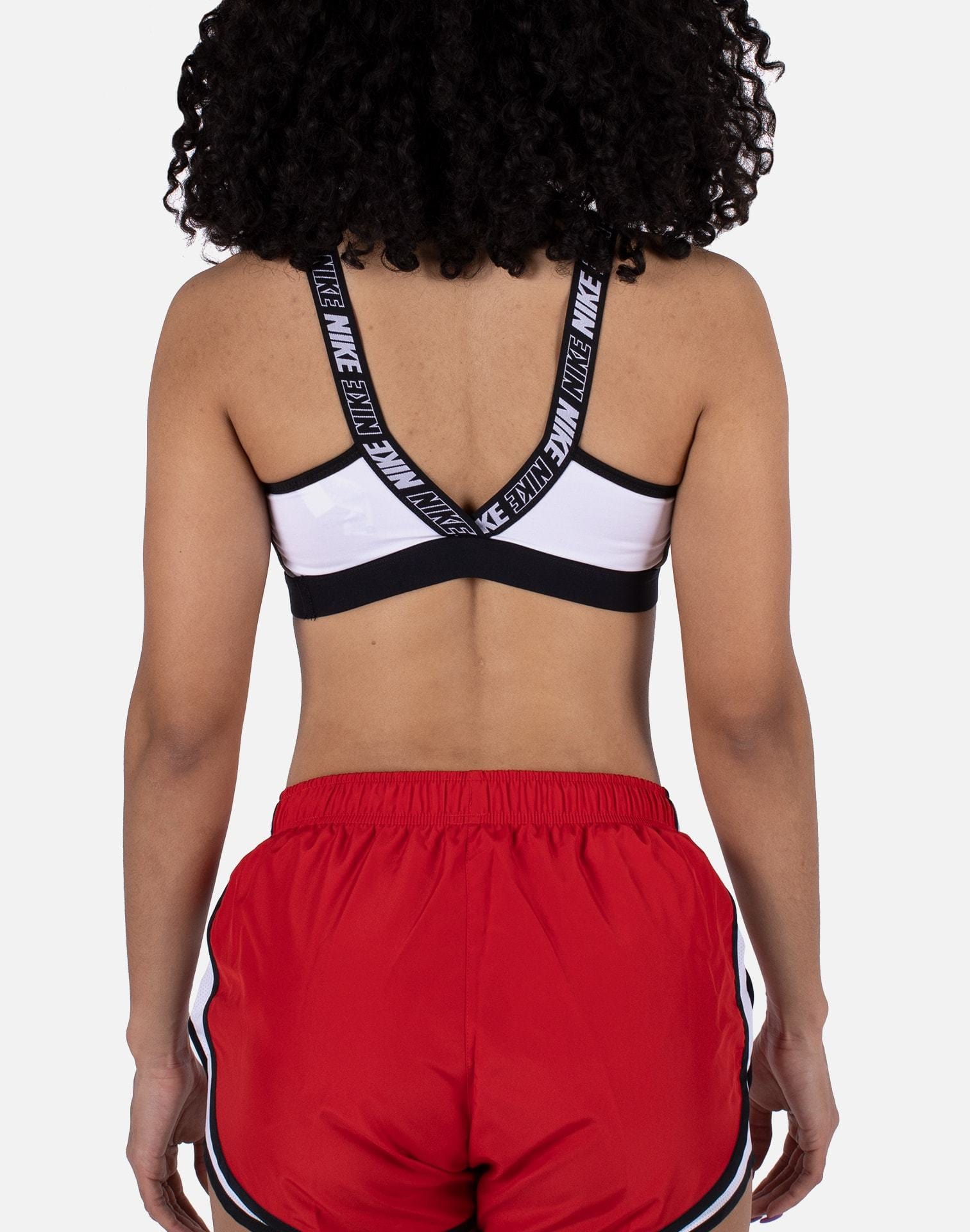 Make a statement in the beautifully color-blocked Nike Classic Sports Bra. A breathable V-back strap design lets you move freely during high intensity workouts such as spin and running, while "NIKE" graphics on the straps and chest make a bold statement.