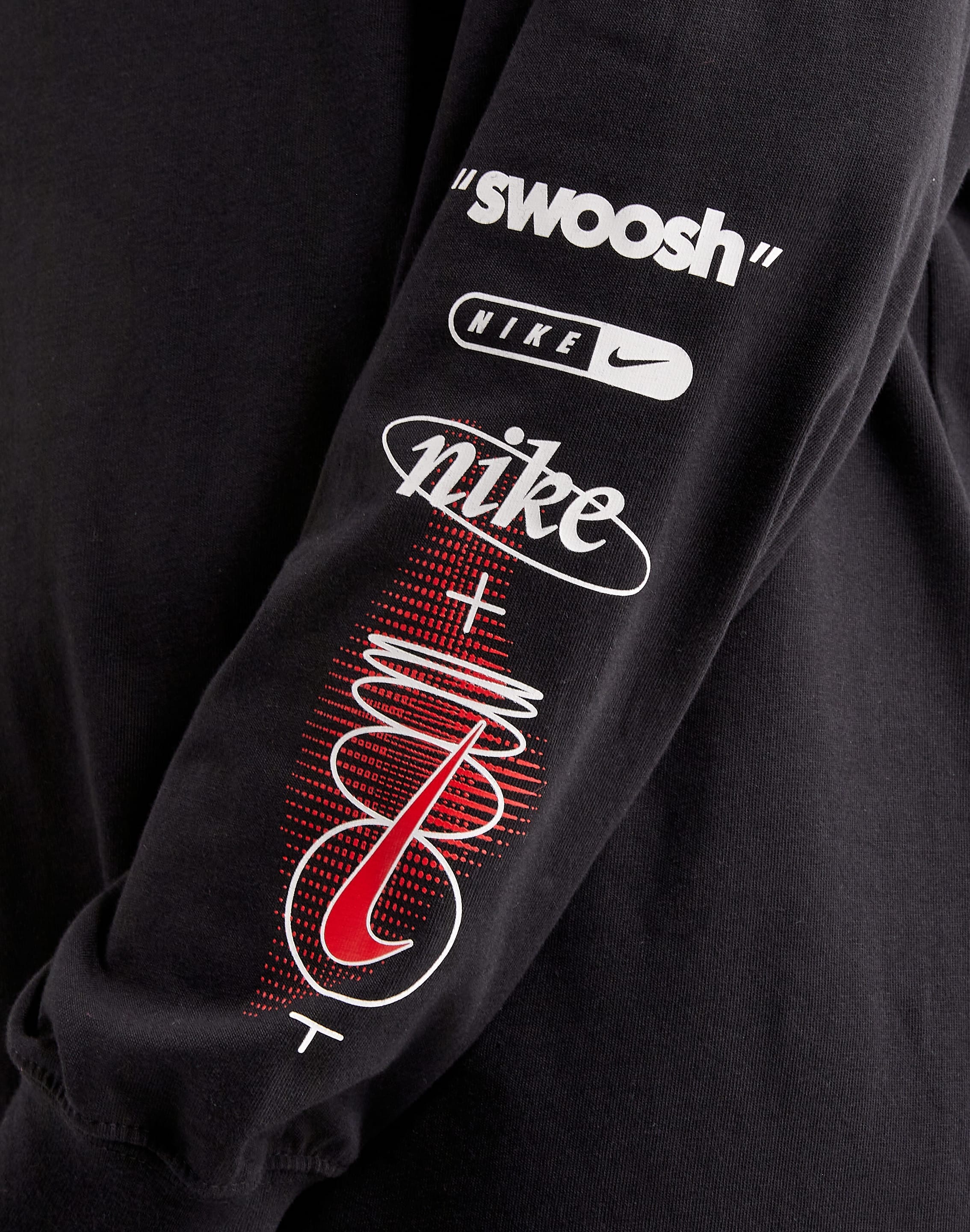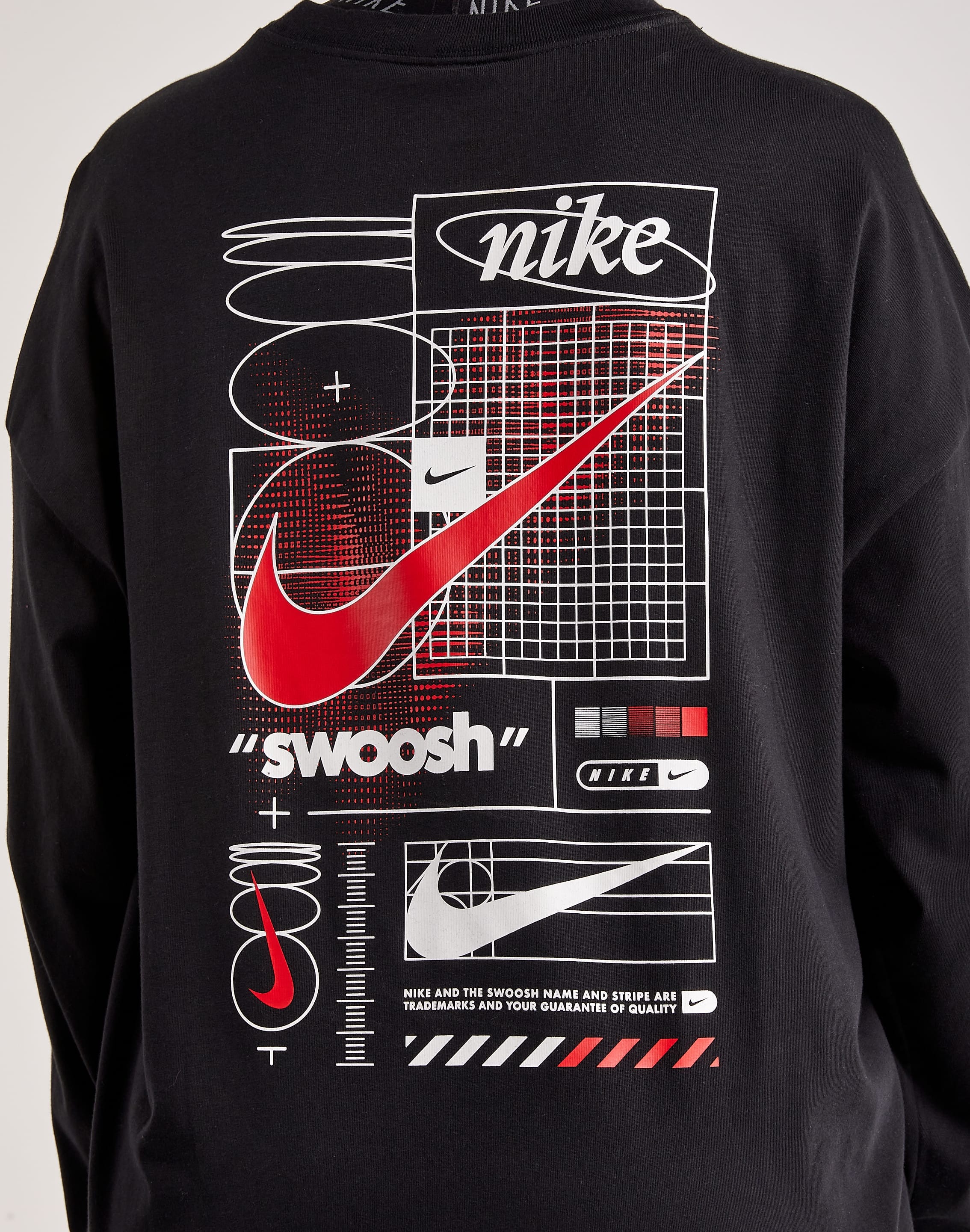 The women's Nike Long-Sleeve Tee sets you up with a soft cotton jersey and graphics printed on the front, back, and sleeves.