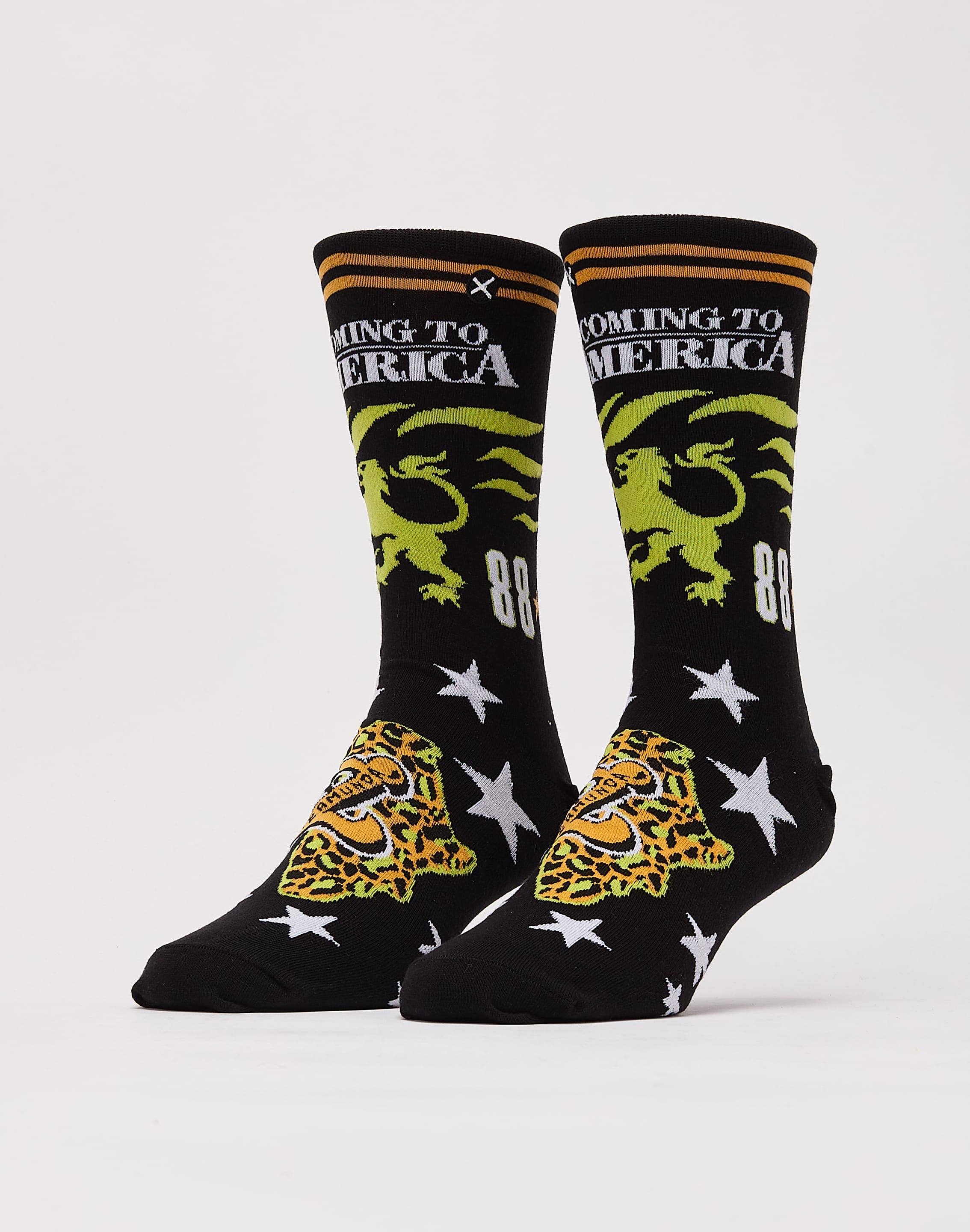 These Coming to America Crew Socks for men have everything you need to stay comfortable. A premium poly-blended construction helps your feet stay dry, while a cushioned heel and elastic arch support hug your feet in all the right places.