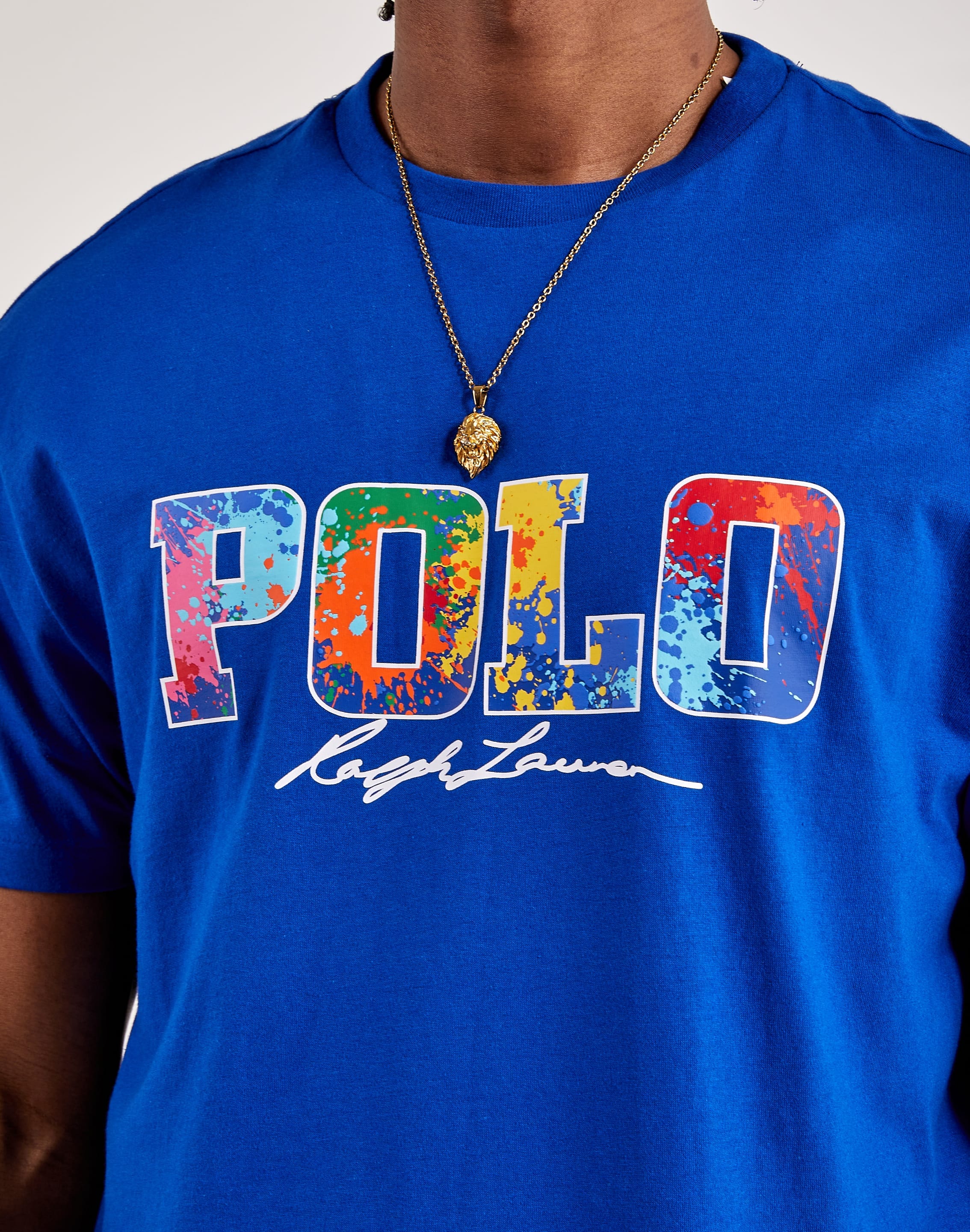 Add a splash of color to your 'fit with Polo Ralph Lauren's Logo Jersey Tee. This men's T-shirt features a Polo graphic with a vibrant paint-splatter print.