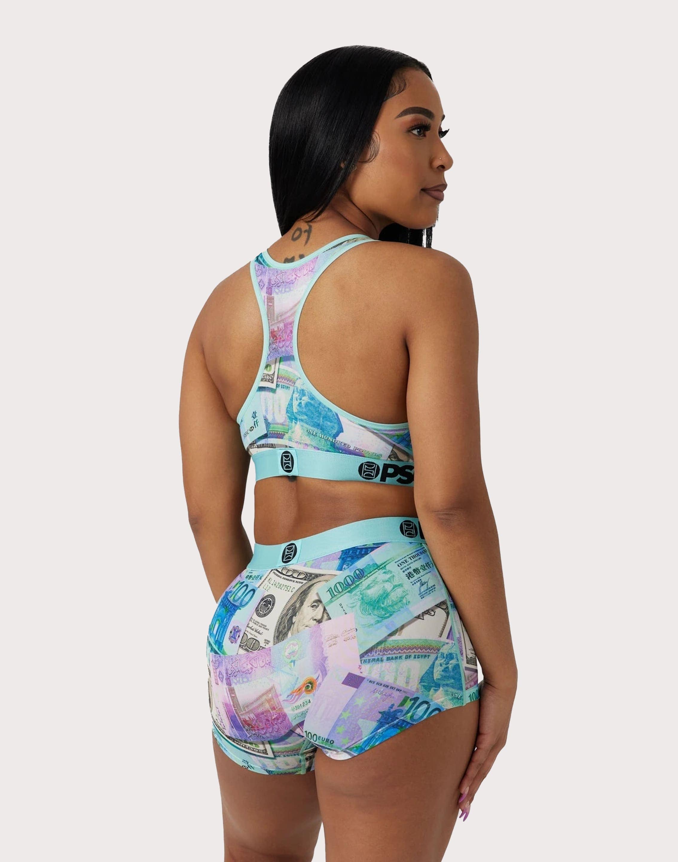 This women's PSD Sports Bra features a classic racerback silhouette with a unique allover-print design. It's made with a lightweight, breathable polyester-blend material for all-day comfort.