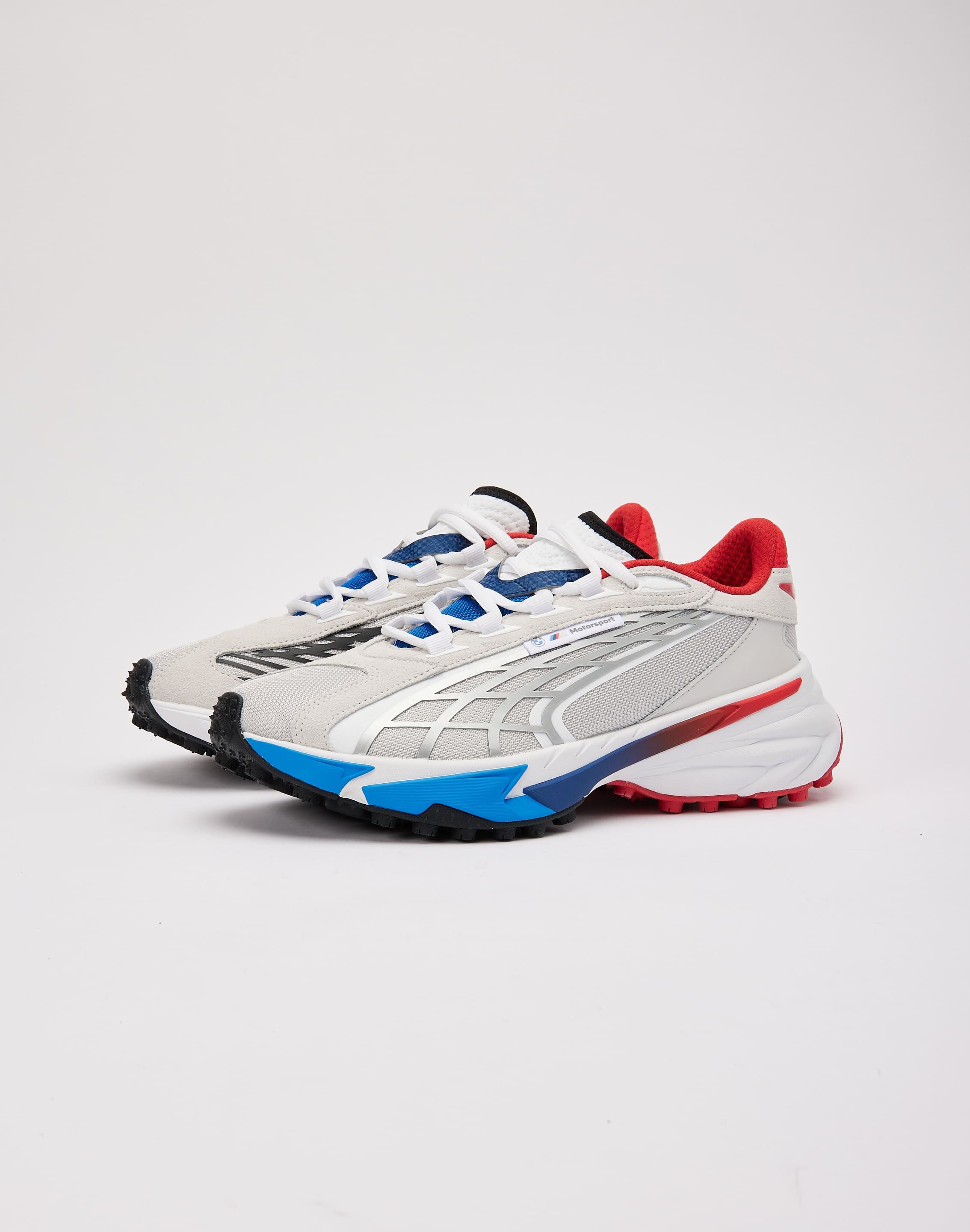 PUMA and BMW Motorsport have teamed up for a new take on the PUMA Spirex. Merging classic performance elements with a contemporary twist, this progressive runner embodies a fresh take on retro style. Taking cues from sprinters' spikes, the outsole delivers traction, while the upper pays homage to PUMA's rich legacy in soccer and motorsport.