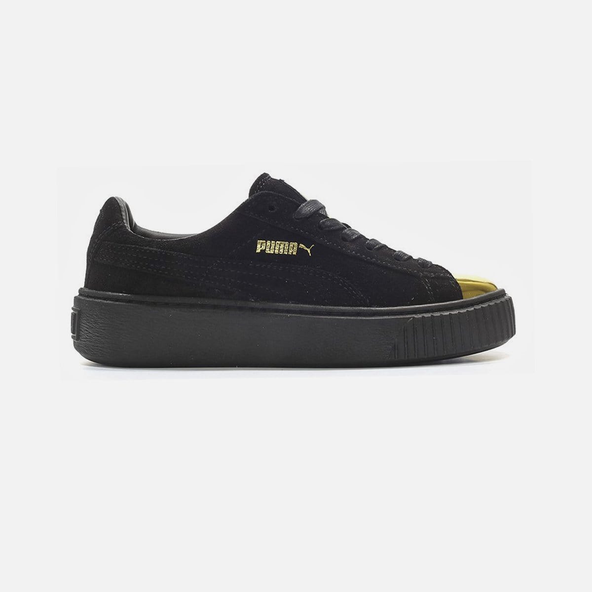 Puma raises the bar with for their iconic Suede model with a raised platform sole that is sure to turn heads. A metallic gold toe accents an otherwise tonal upper of soft, rich suede to keep things classy. Not for the feint of heart! The Puma Suede Platform (Black/Black-Metallic Gold) is Available now!