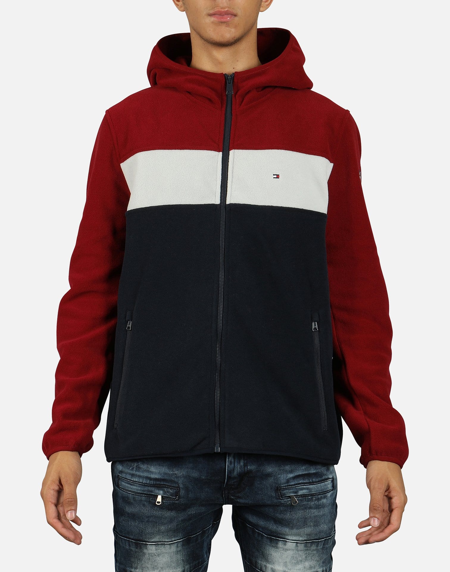 Tommy Hilfiger men's sweatshirt. This hooded sweater combines bold colorblocking with stretch fabric for supreme comfort. A sporty, dimension-changing, instant classic styled in our slim, vintage fit.
