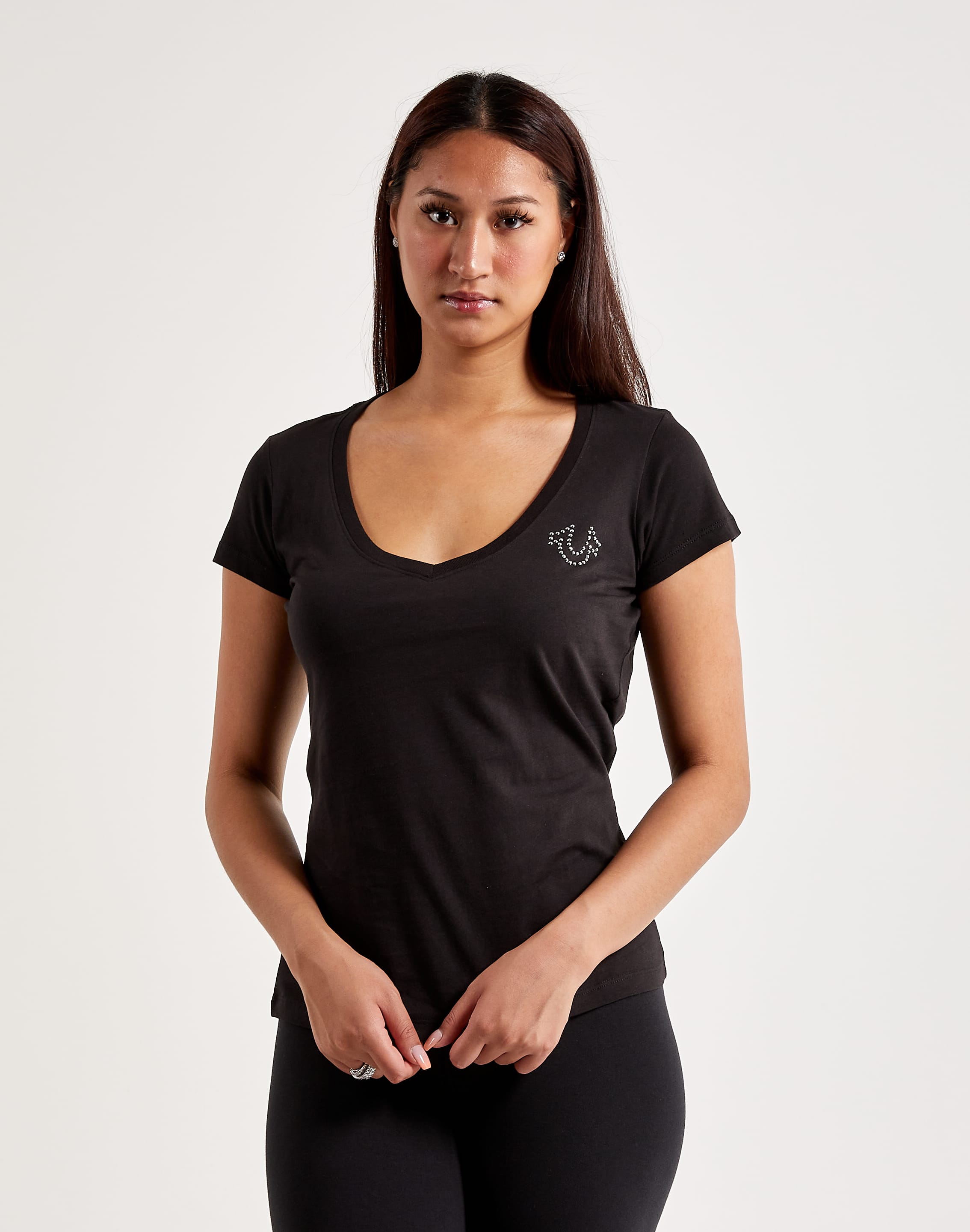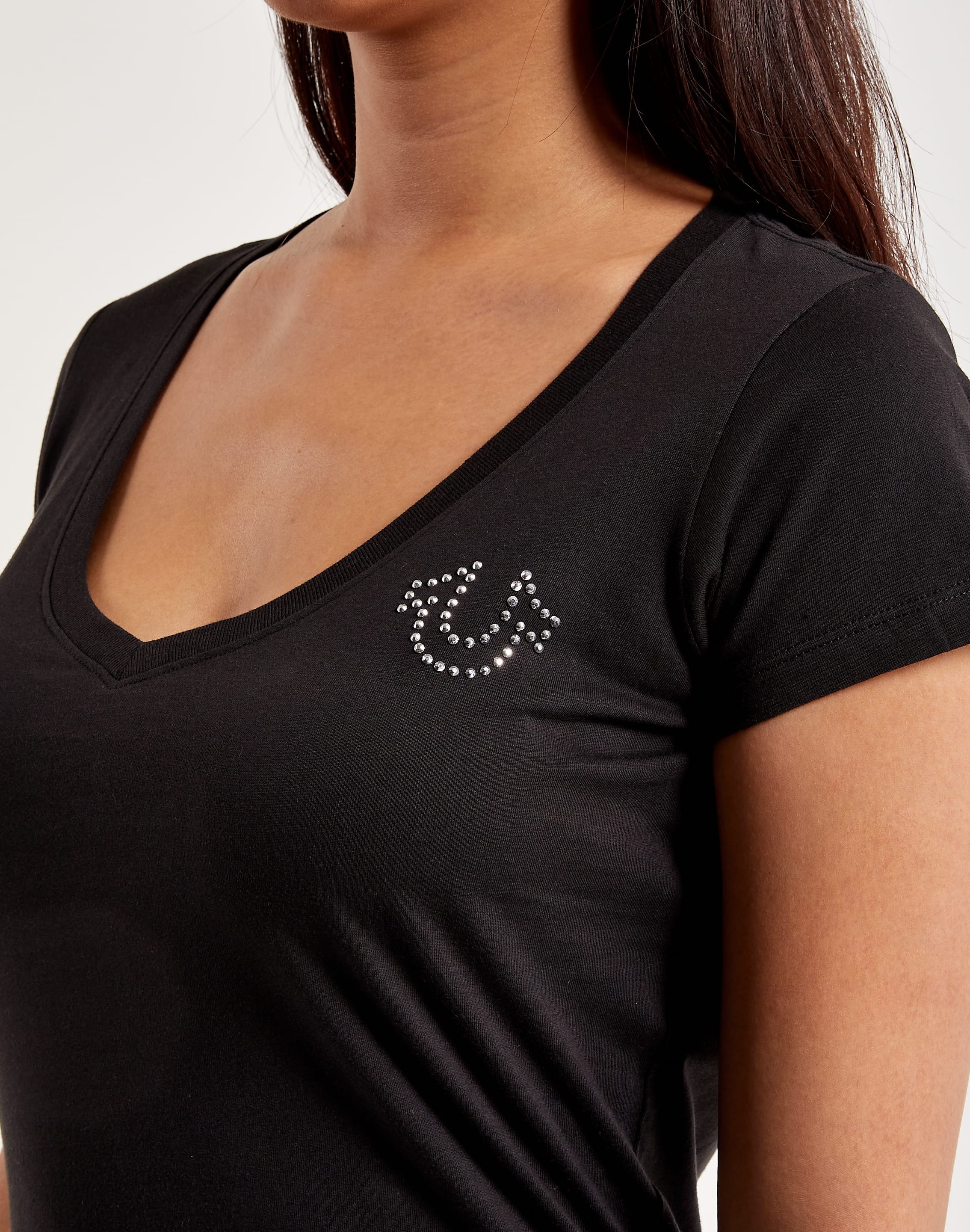 Elevate your everyday look with True Religion's Crystal Logo Slim V-Neck Tee. It features a studded horseshoe logo at the chest and bold "True RLGN" lettering at the back.