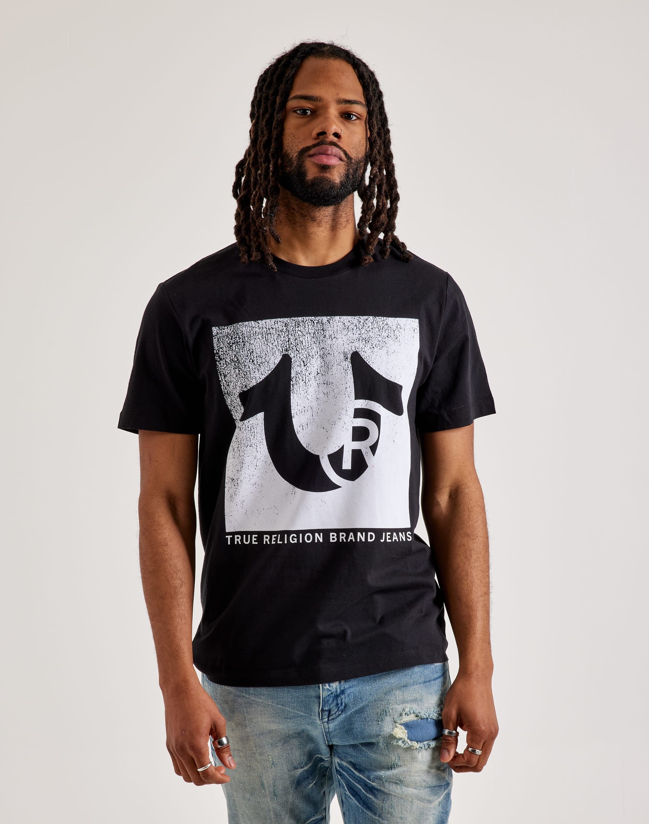 You've already got the jeans – now it's time to complete the look with the True Religion Distressed Registered Horseshoe Tee. This lightweight T-shirt features a printed front graphic that adds flavor to any 'fit.